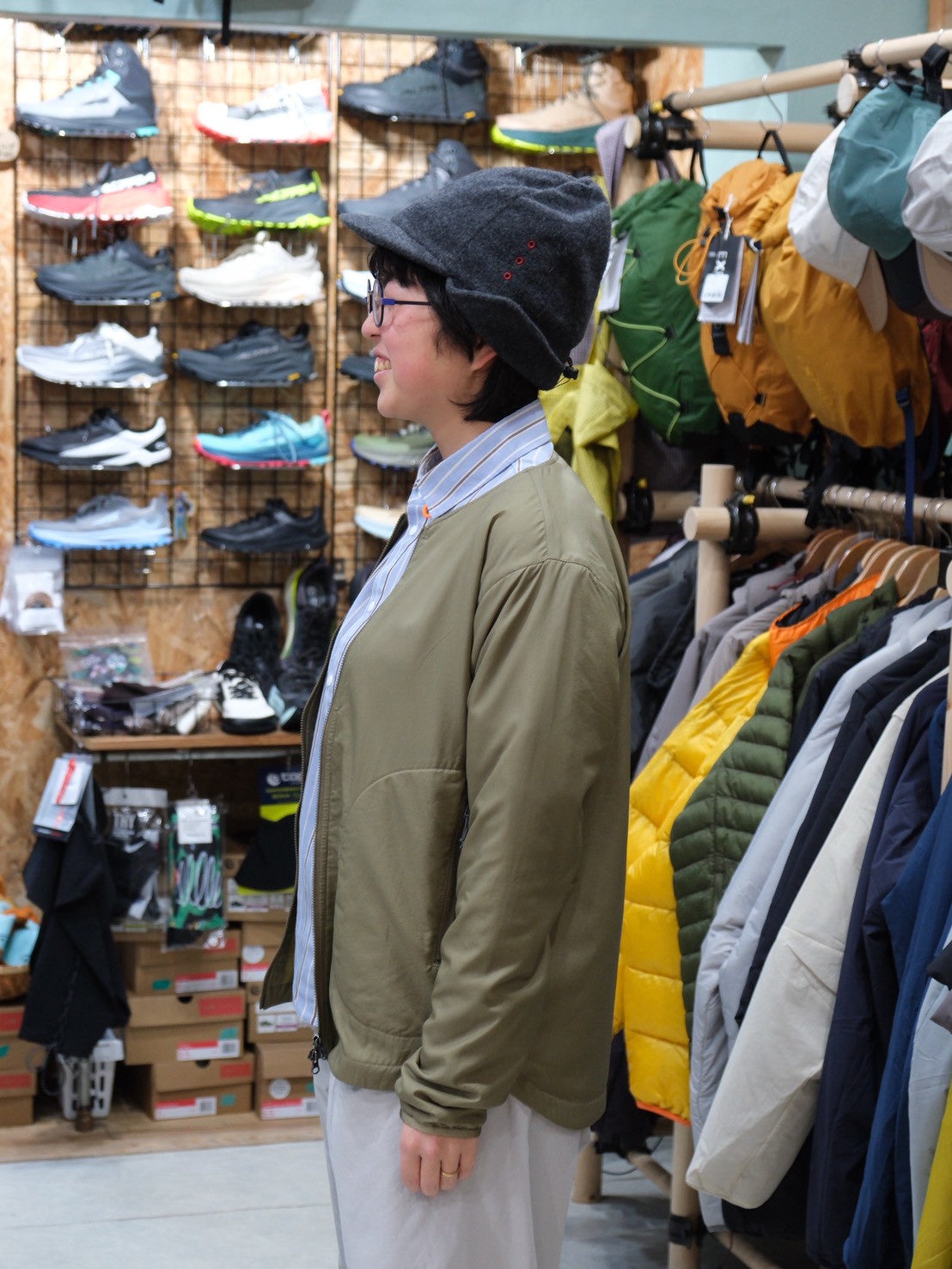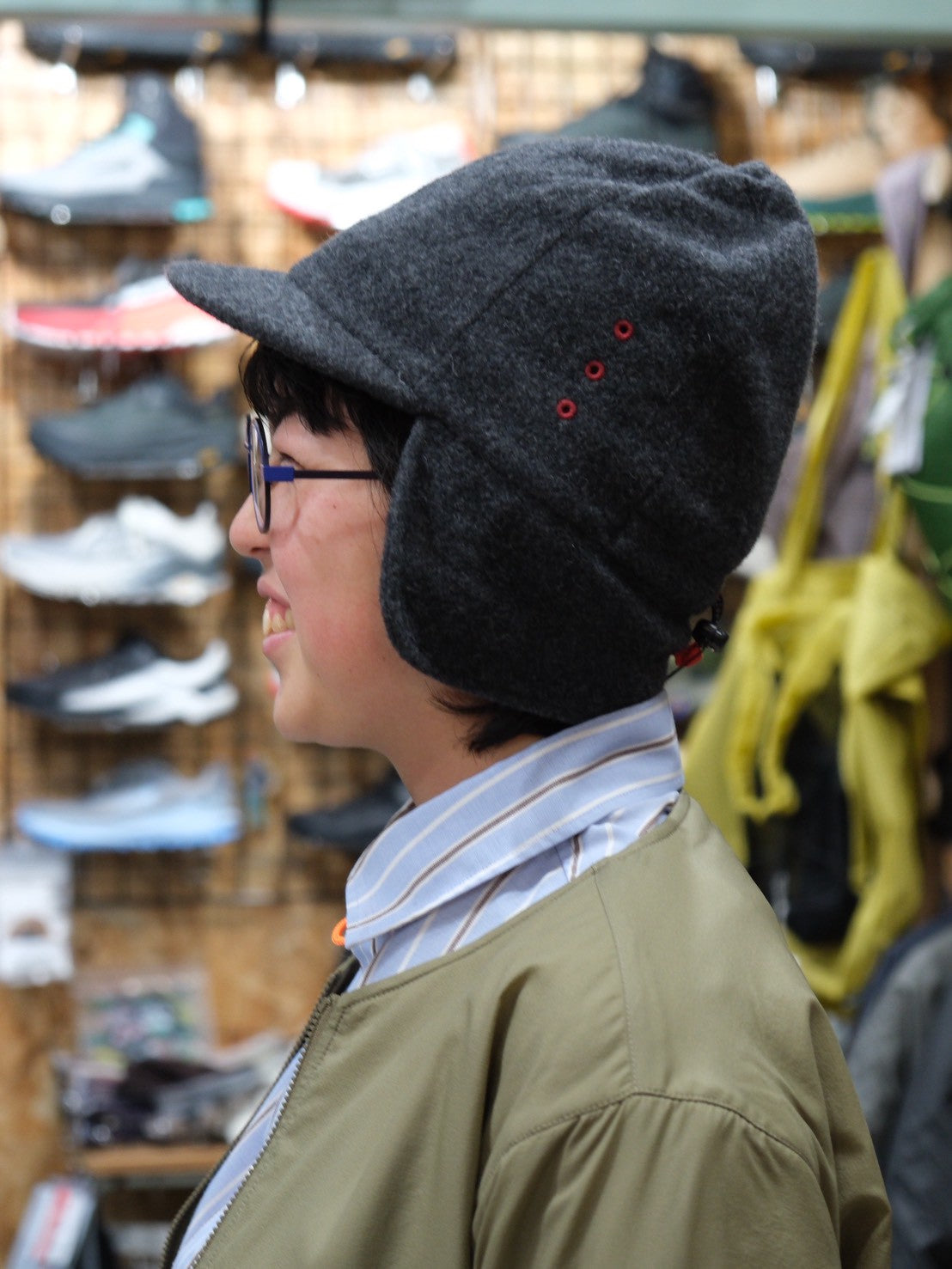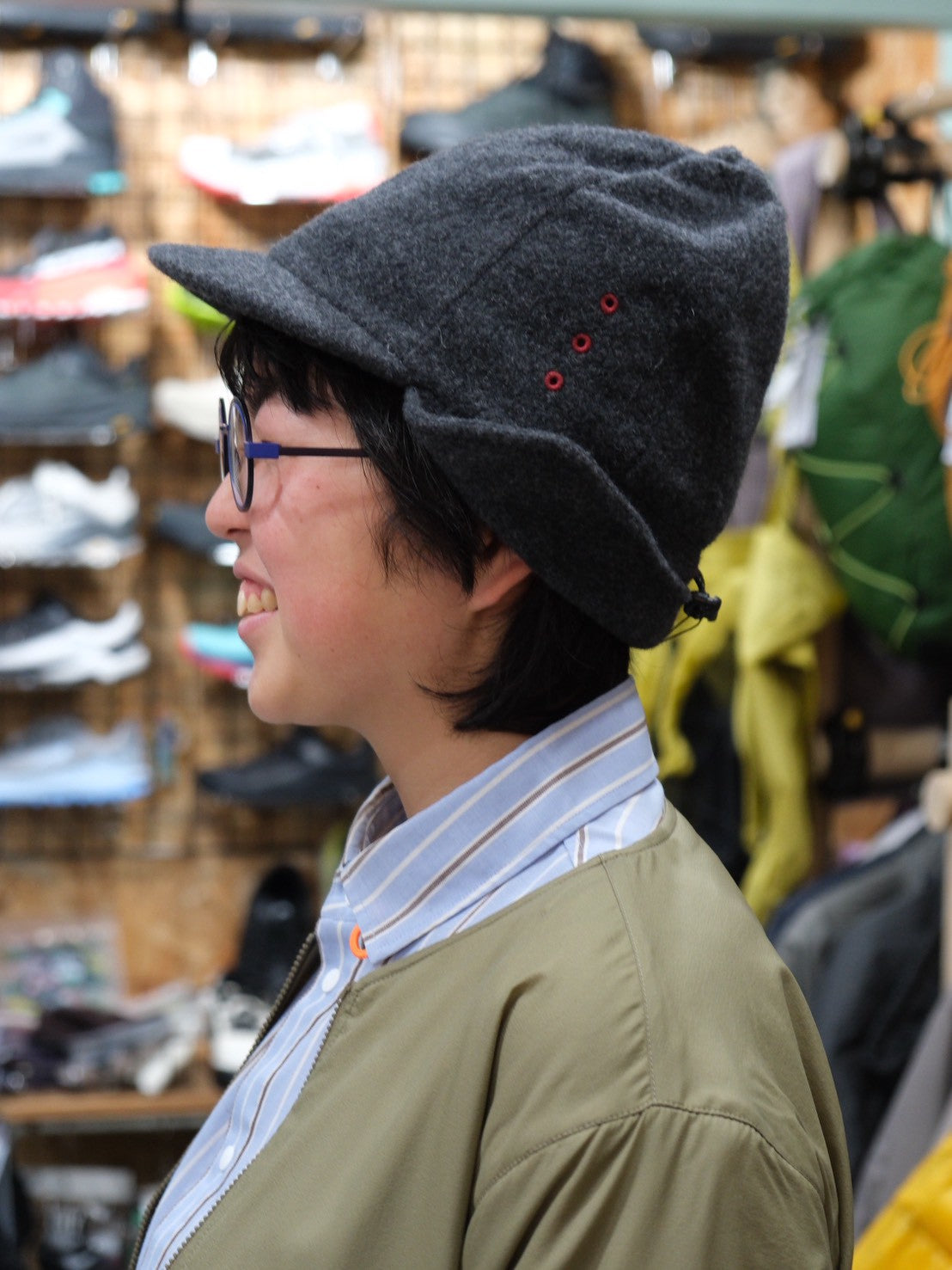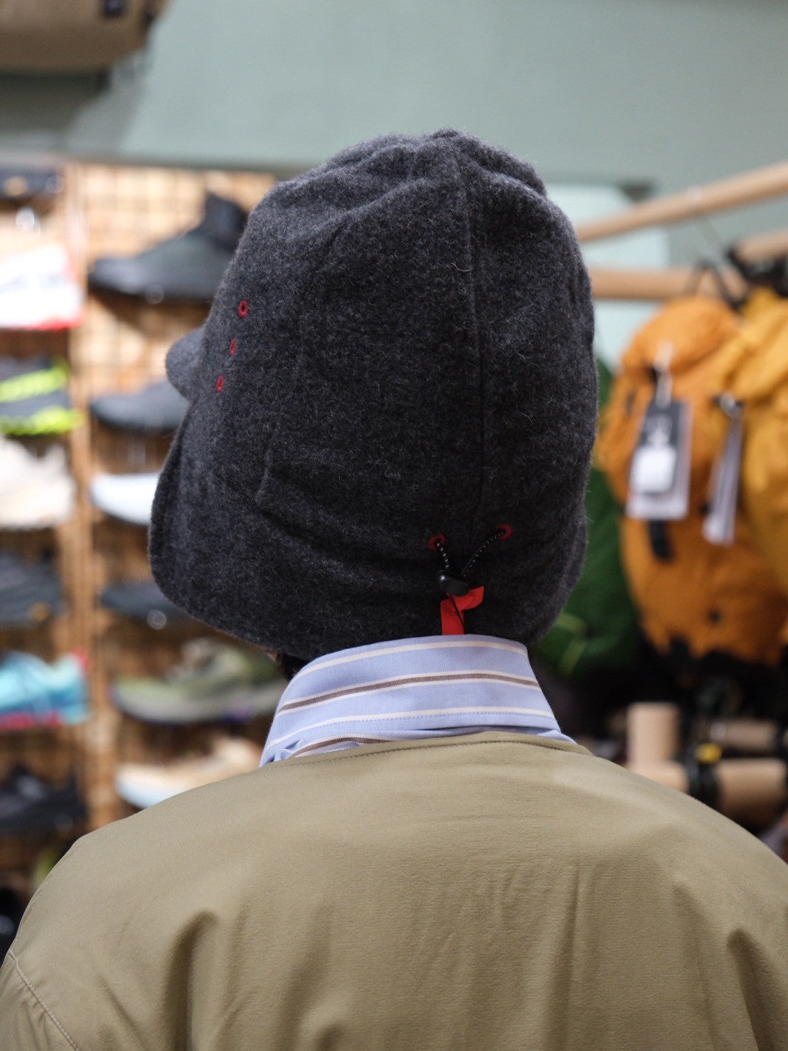 紅葉の頃から春先までの長いあいだ使用できます。2サイズ展開でやや大きめの作りになっていて、後部のゴムスピンドルでフィットを調節できます。耳と後頭部を寒さから守るフラップは固定式ではないので簡単に上げ下げできます。短めのツバは冬の斜光を遮りながらも視界がいいので安全に山を歩くことができます。少しくらいの雨であればウールが吸収してくれて、濡れても冷たさを感じません。