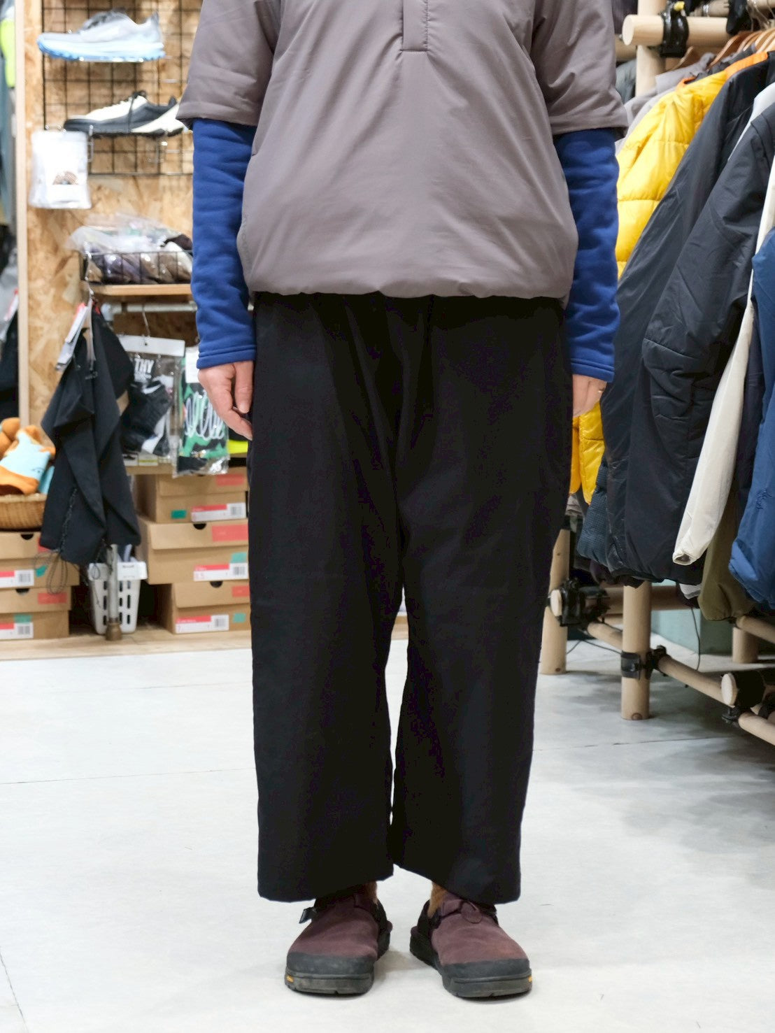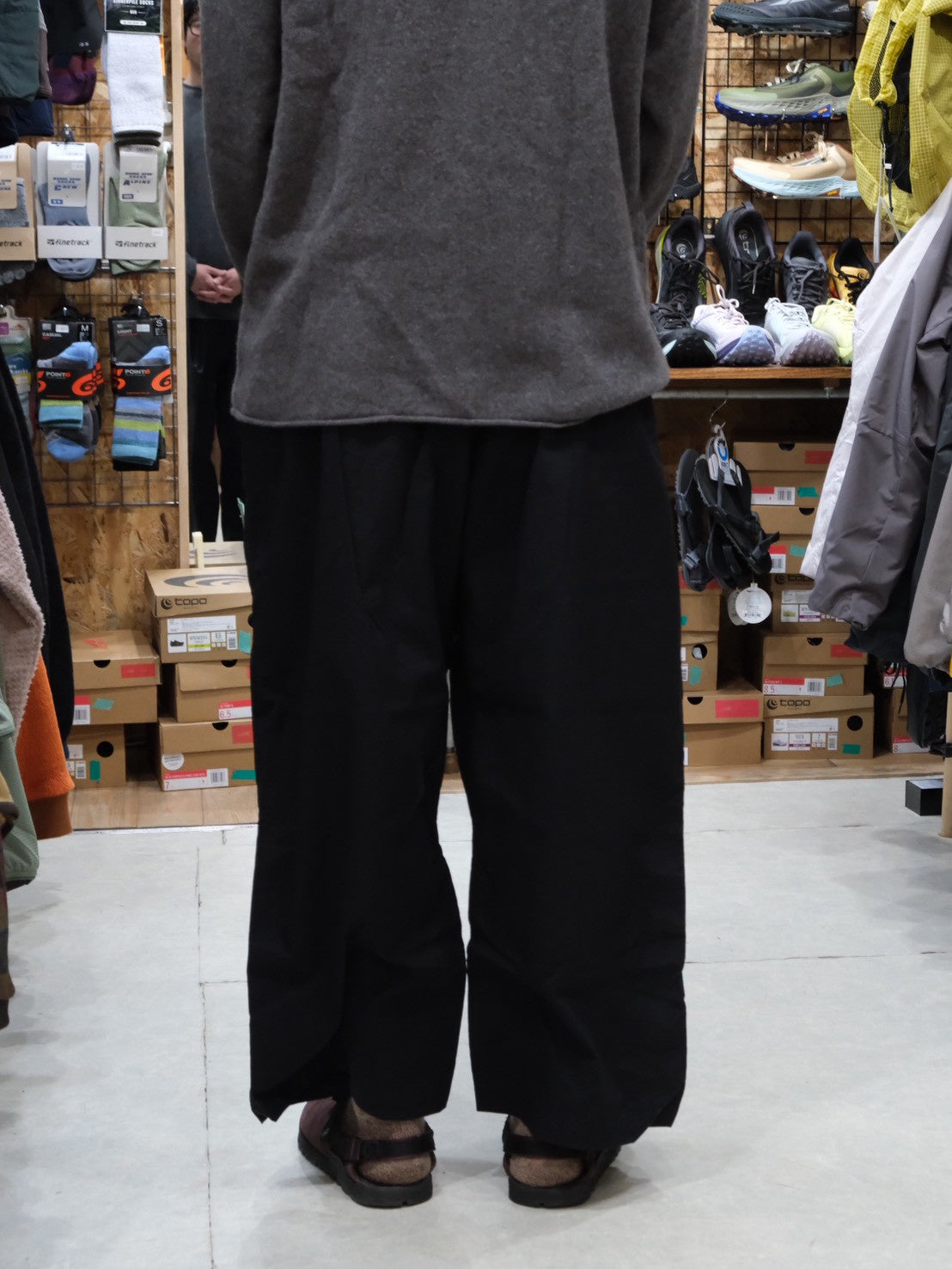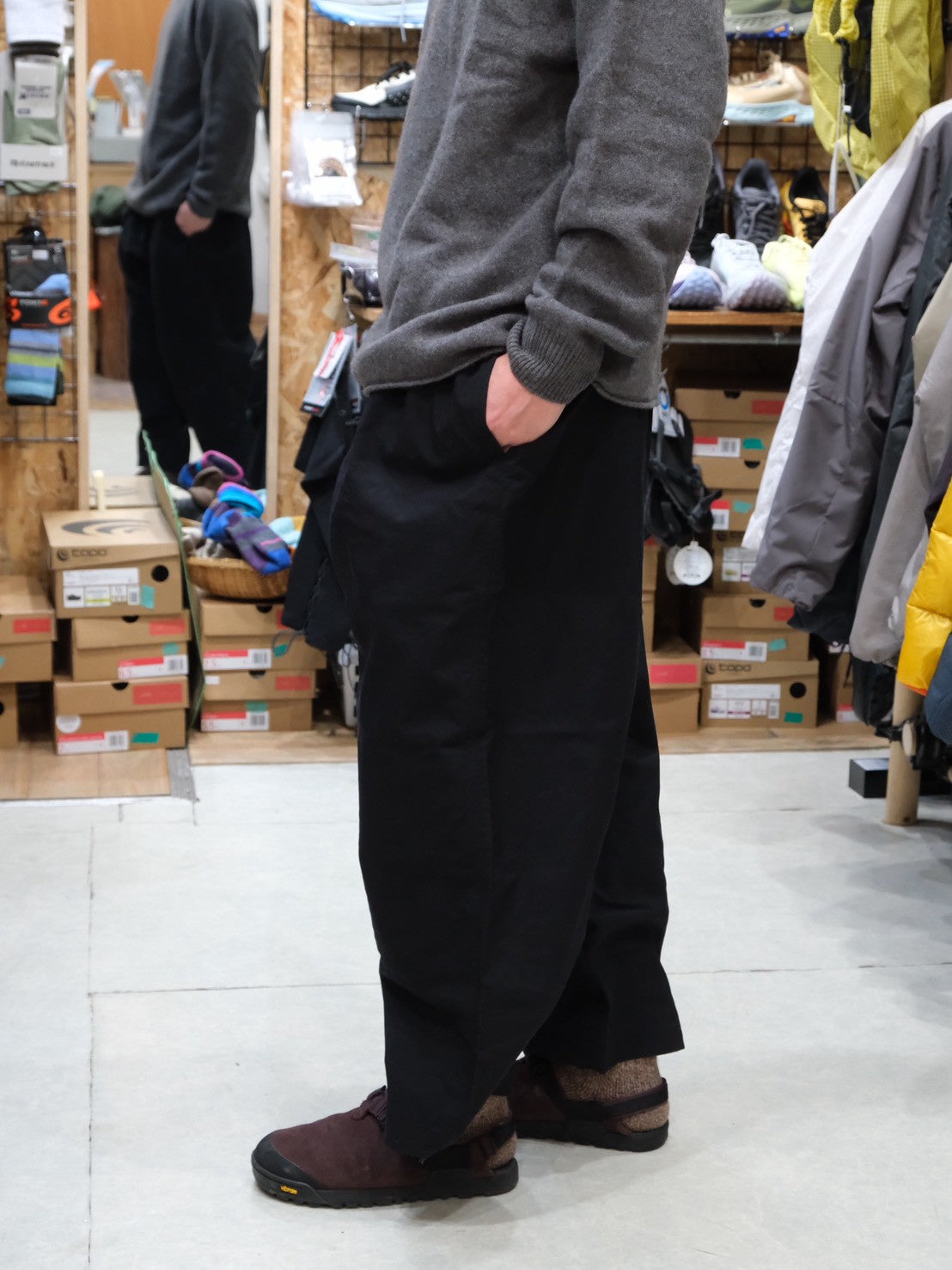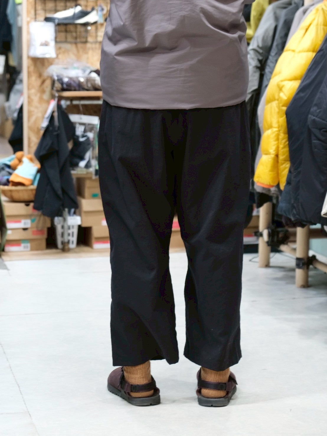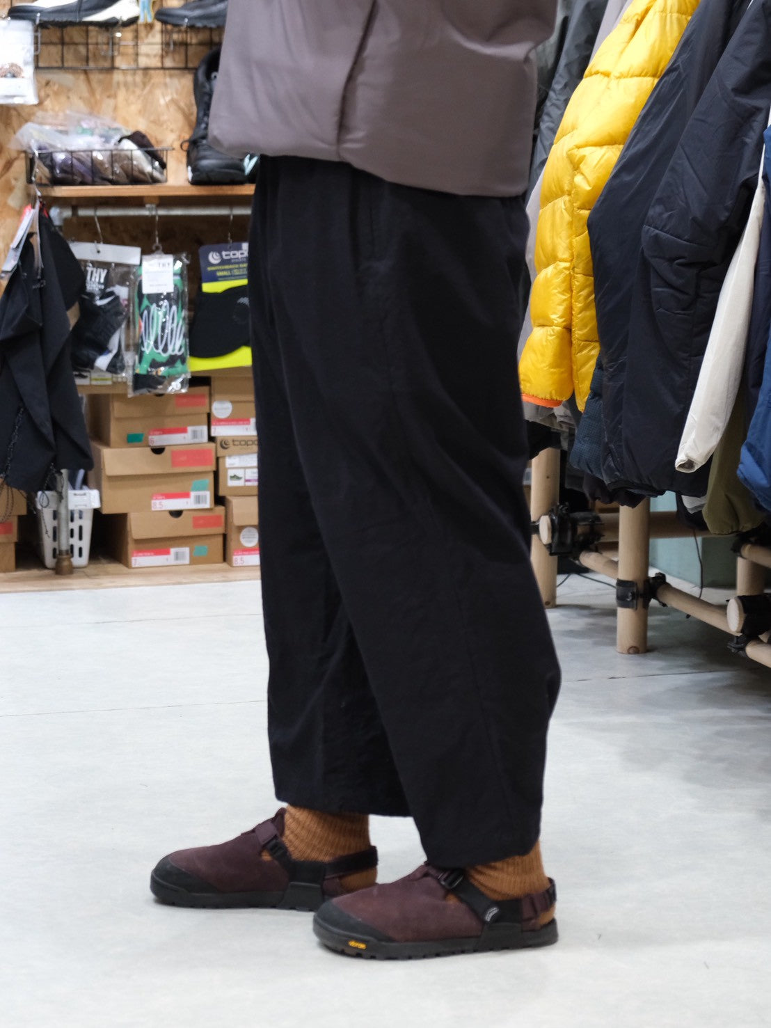 光沢がなく適度なハリコシのあるヴィンテージナイロン素材を採用したこのパンツは秋から春までのシノギングに最適です。使い勝手を考慮してウェストにストレッチドローコードを入れ、腰の両脇に前後に振り分けたポケットを設けていますが、それ以外は柔道パンツそのままの作りで、膝裏には共生地を宛てた補強が施されています。広い股のマチは膝があごに付きそうな急登の動きに難なく追従し、巾広で寸胴な作りによってワイドパンツならではのベンチレーション効果を得ることができます。