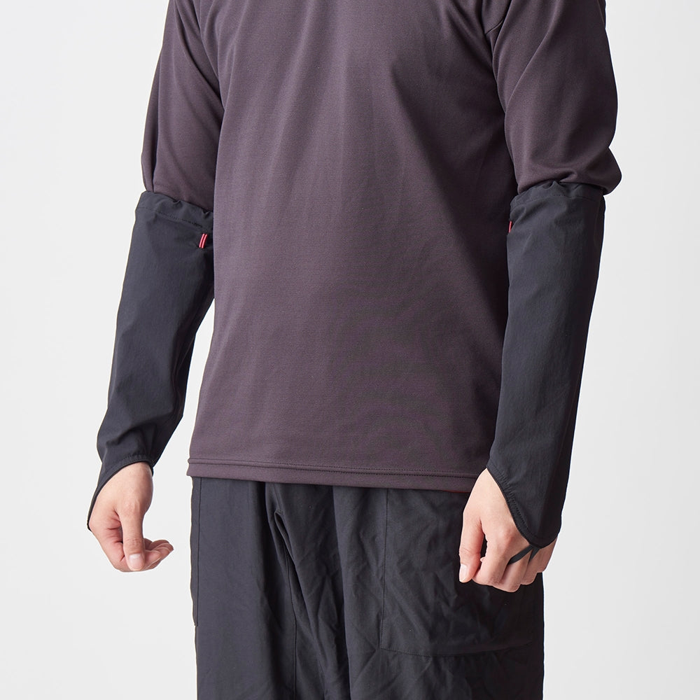 薄手で肌触りの良いダブルフェイスストレッチファブリックを使用したソフトシェルの手甲です。すっきりしたシルエットは藪漕ぎにおける無駄な引っ掛かりをなくし、防風性が冷えを防ぎ、適度な通気性が蒸れを軽減します。手の甲から肘の下まででそれらの効果を感じることができます。素肌に直接つけると汗による蒸れを感じることがありますが、ハチジュウハチヤなど長袖Tシャツの上に着けると蒸れを緩和できます。甲先のループを中指に通すことでズレを防ぎ、裾の丸ゴムとストッパーによってフィットを調節できます。引っ張ったゴムがぶらぶらして邪魔にならないように内側に差し込めるようにできています。