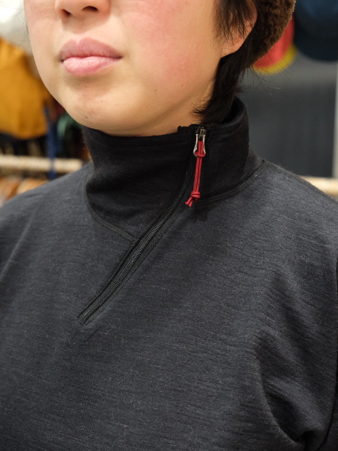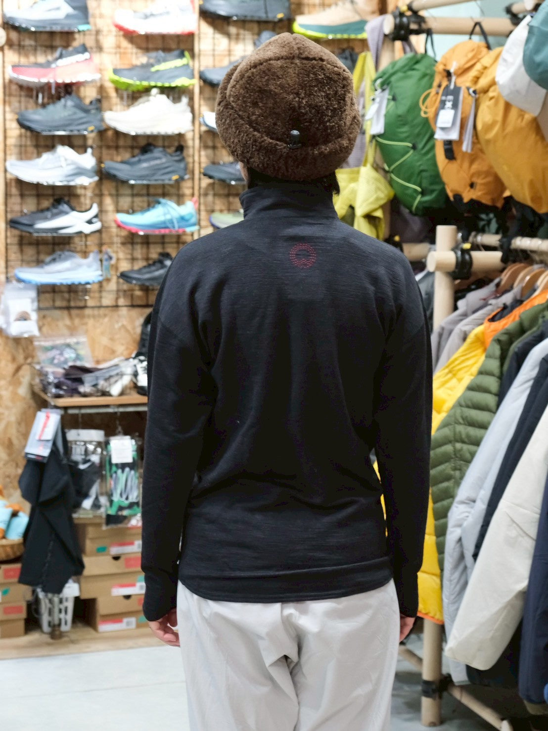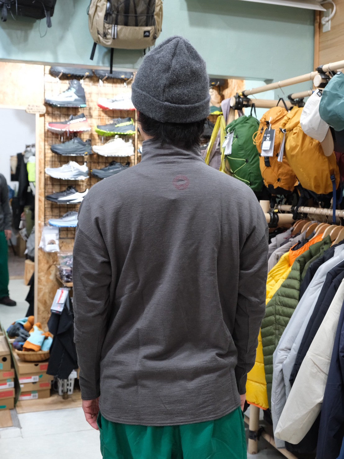 ほどよい高さの衿は収まりがよく首まわりを保温します。緩急を繰り返すシノギングにおいてオーバーヒートしない高い通気性を備えているのは当然ですが、肌面のメリノウールパイルによって丁度いい保温性を提供するばかりでなく、優れた調湿性と放出性で汗を処理し、長丁場の汗だくシノギングにおいても高い防臭性で快適な状態を保ちます。また、コードロックなどを排したすっきりとした裾回りはバックパックのヒップベルトに干渉しません。