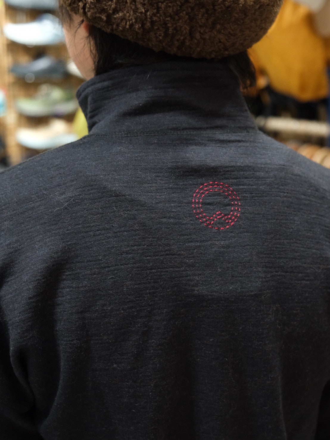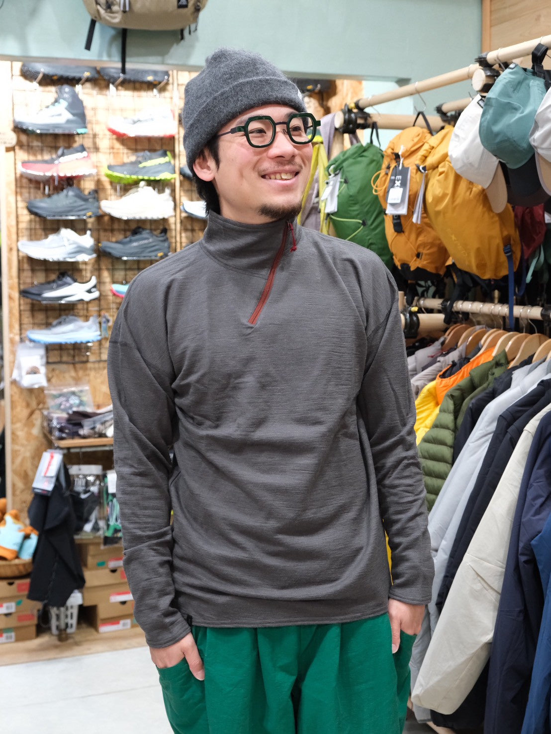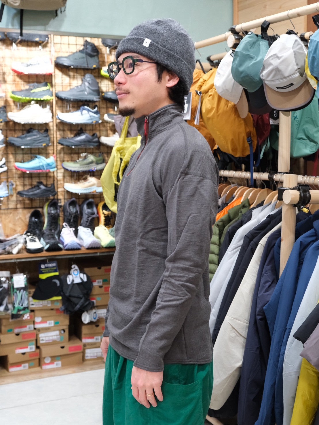 ほどよい高さの衿は収まりがよく首まわりを保温します。緩急を繰り返すシノギングにおいてオーバーヒートしない高い通気性を備えているのは当然ですが、肌面のメリノウールパイルによって丁度いい保温性を提供するばかりでなく、優れた調湿性と放出性で汗を処理し、長丁場の汗だくシノギングにおいても高い防臭性で快適な状態を保ちます。また、コードロックなどを排したすっきりとした裾回りはバックパックのヒップベルトに干渉しません。