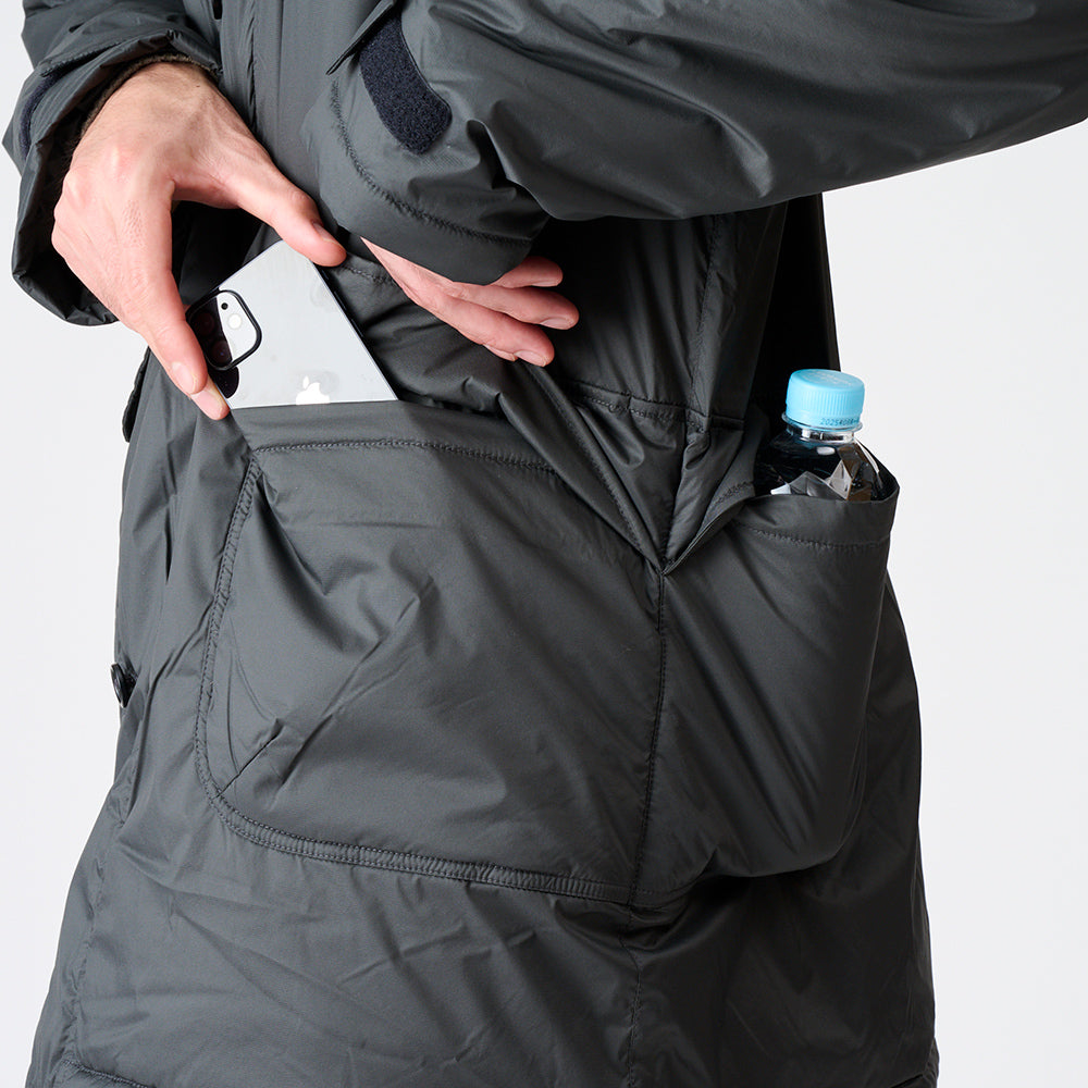 ・身頃の前後に振り分けた大き目の中綿入りポケット+フラップ