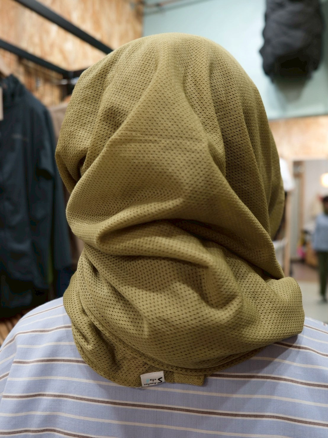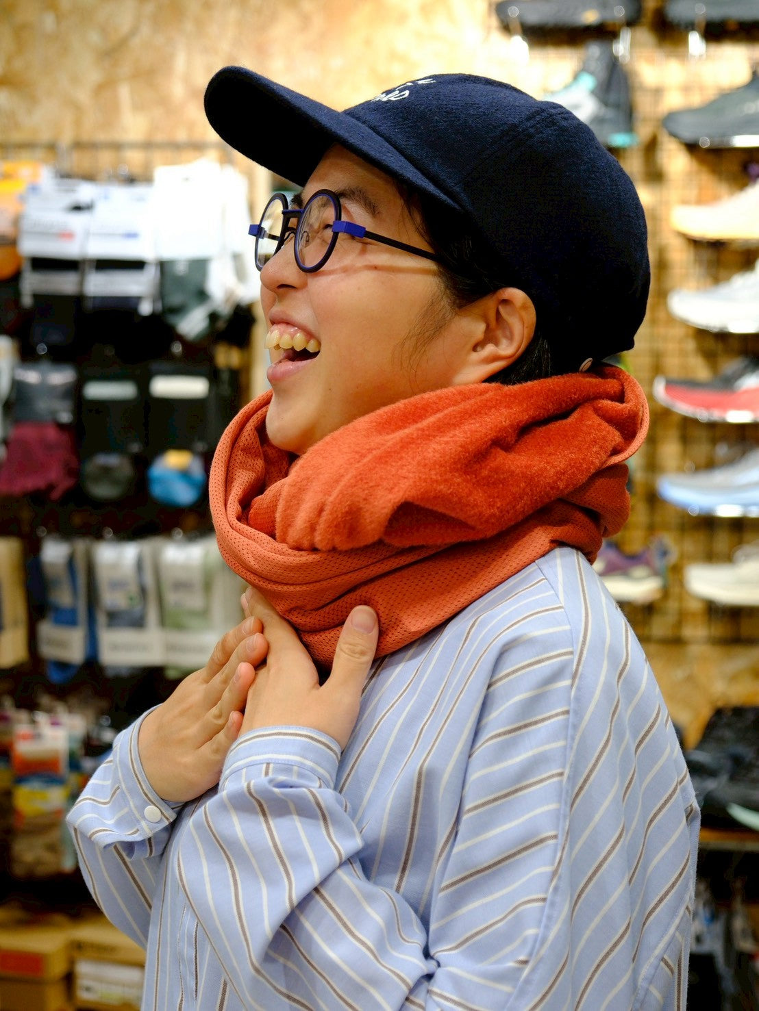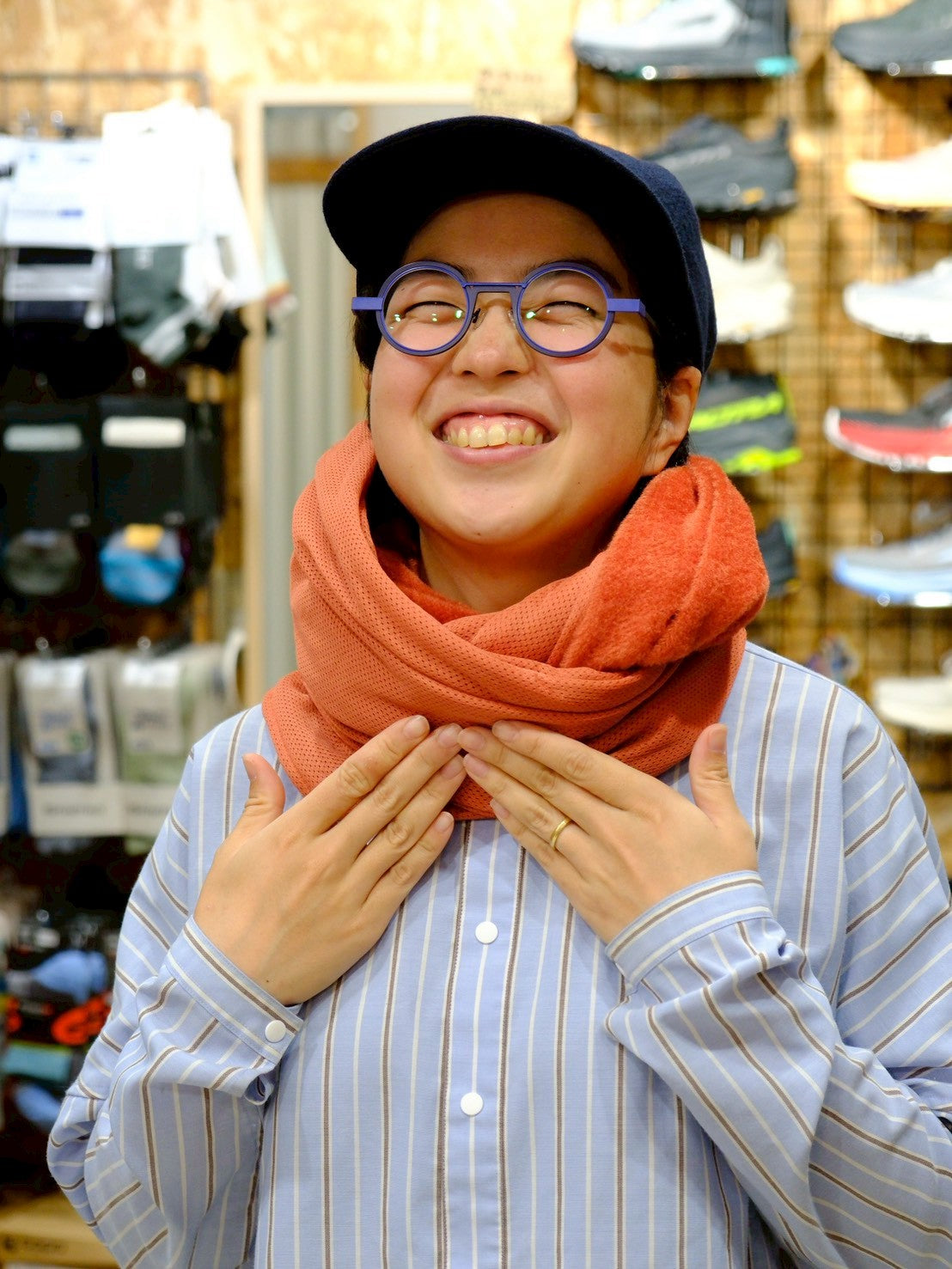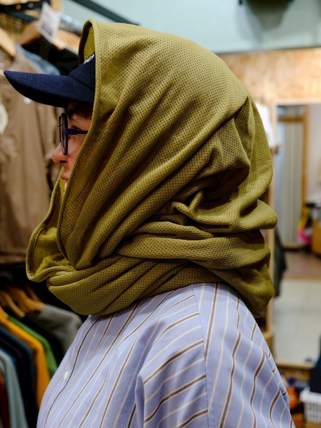 スナップボタンを留めて、スヌードに。首との間にすこし隙間があくので、程よく保温し、程よく蒸れを逃がしてくれます。