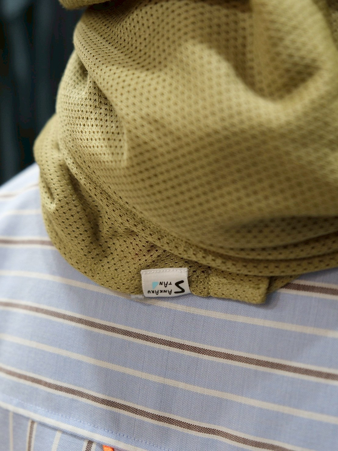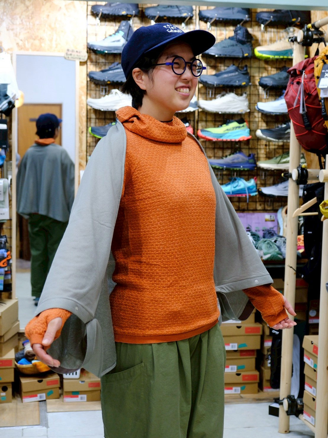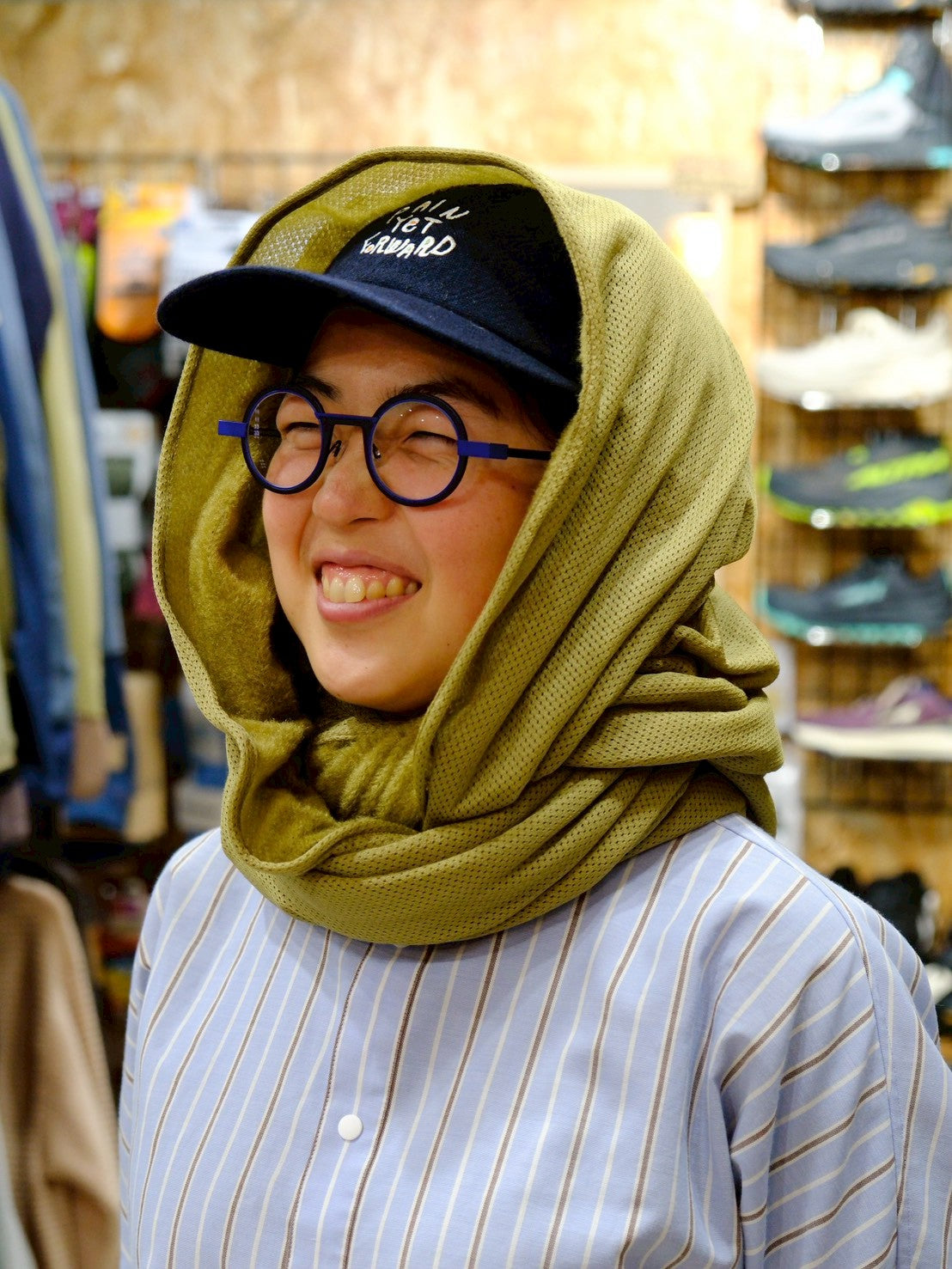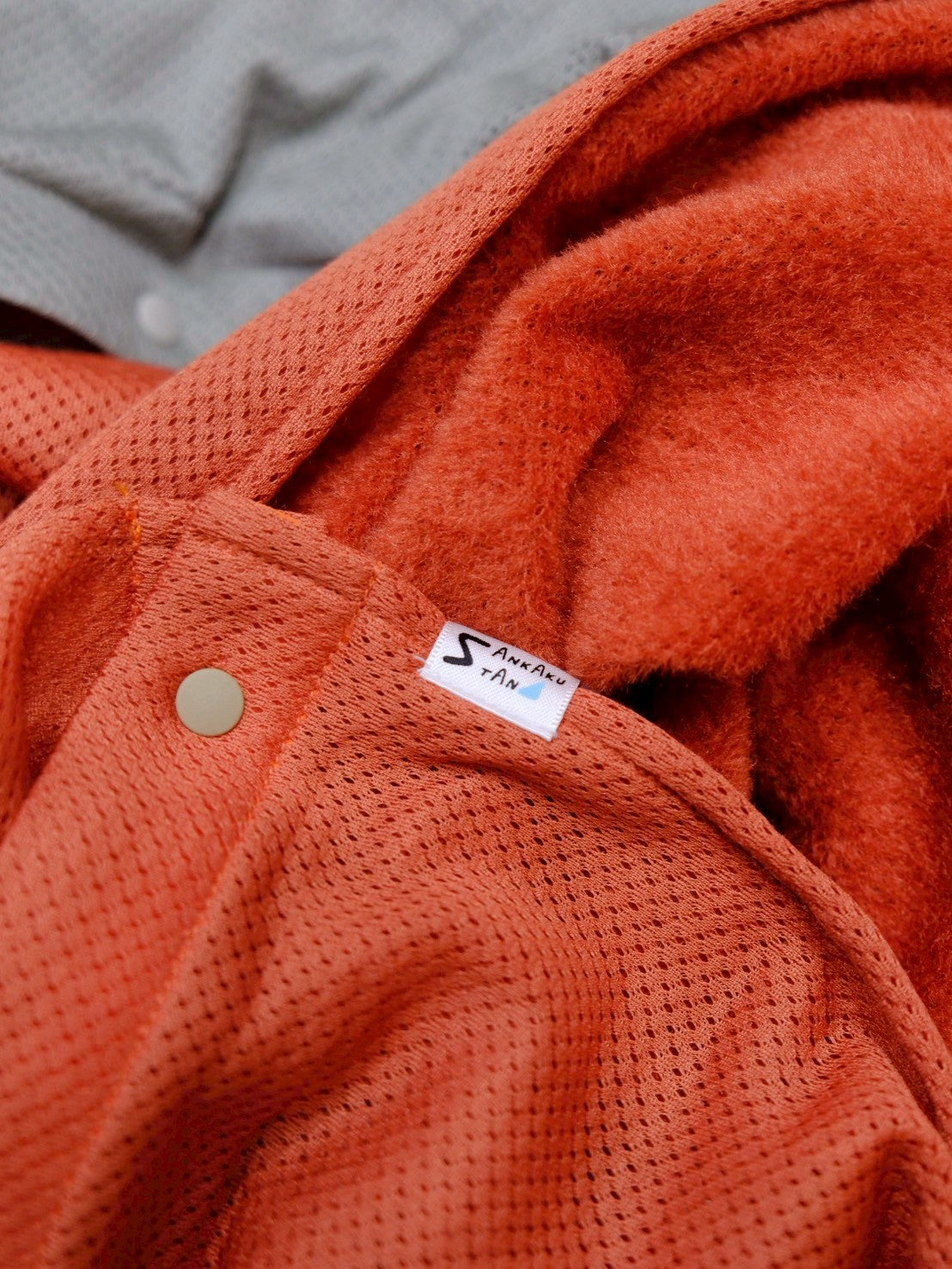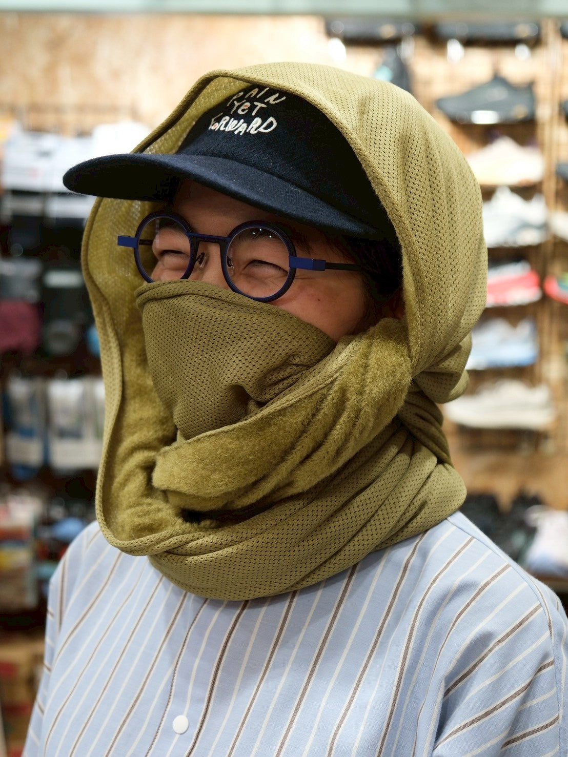スナップボタンを留めて、スヌードに。首との間にすこし隙間があくので、程よく保温し、程よく蒸れを逃がしてくれます。