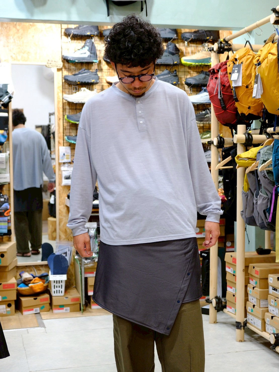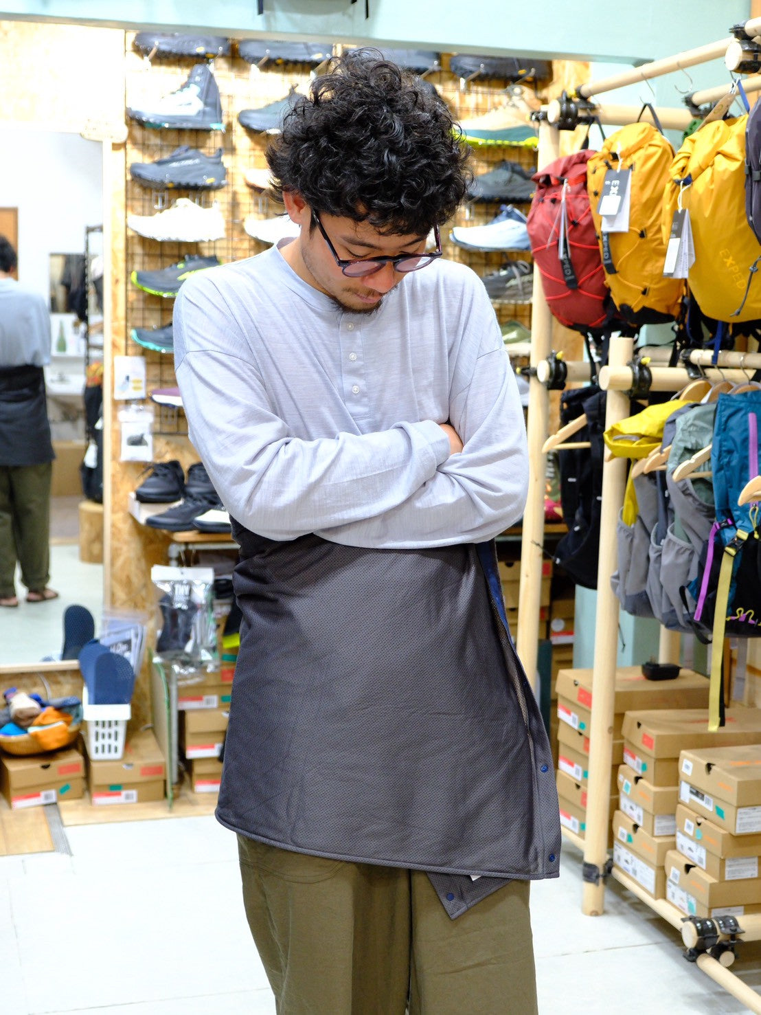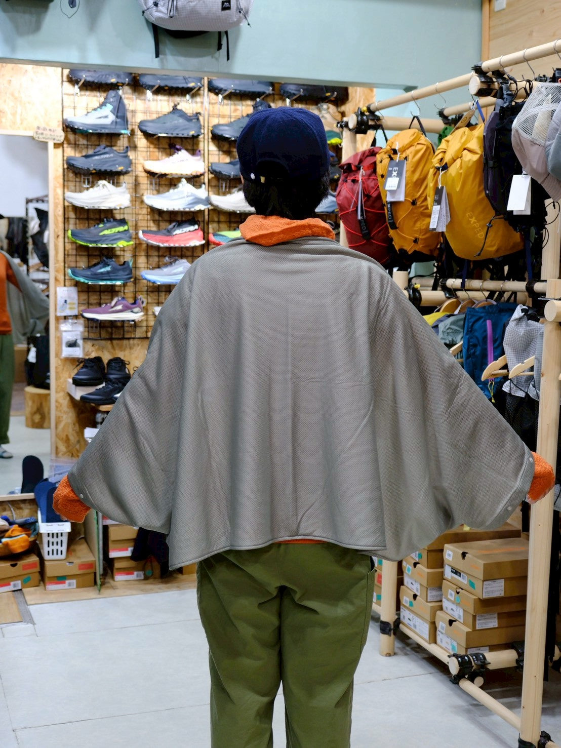 ④肩の保温肩からさらっと巻いて、ちょっとした休憩時の保温に使用できます。座っているときにひざ掛けとしても使えますね!