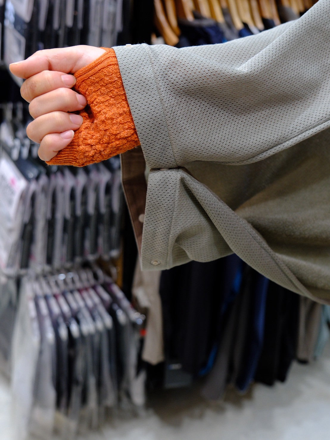 ⑤『袖モード』。肩にかけて袖口のボタンを留めると、まるでカーディガンのように着ていただけます。