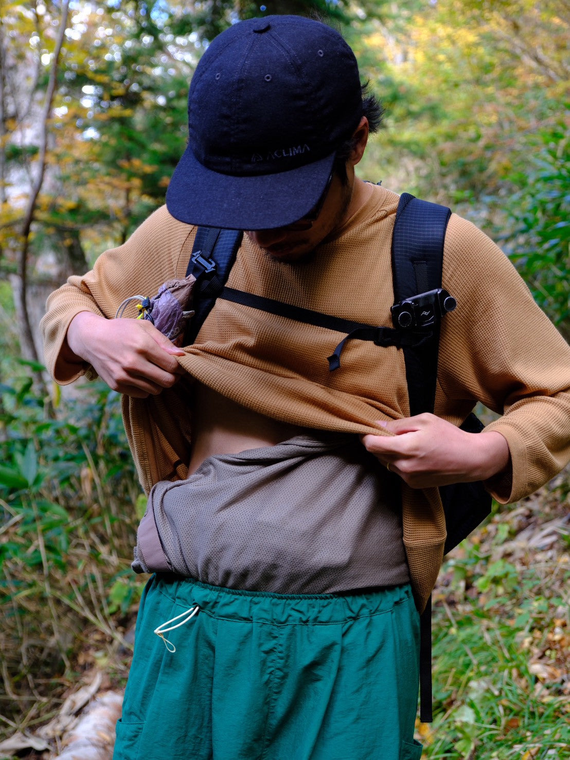 ⑥簡易腹巻バスタオルのように体に巻き付けてあげると、着脱が楽ちんな腹巻にもなります。体の中心を冷やさないように保温する効果と、バックパックをおろした後の背中の汗を吸い取って乾かす効果もあります!
