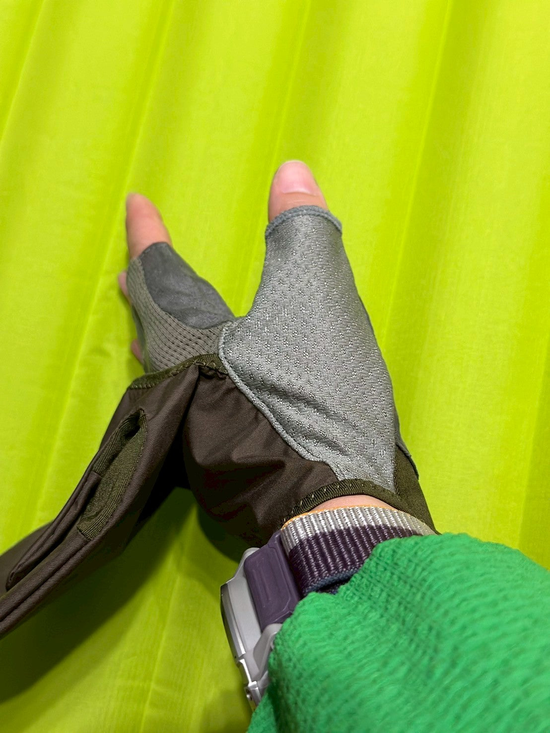 フィンガーレスグローブのシェルフード付きグローブの良いところは、登りで手が暑くなってきても脱がなくていいところです。