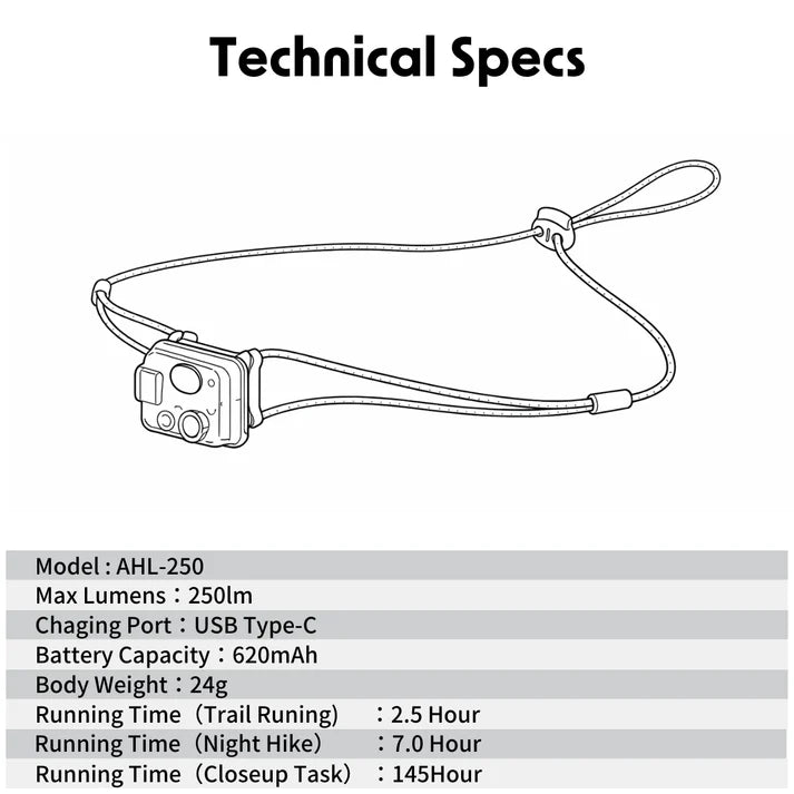 arata完全独自設計のヘッドランプAHL-250はトレイルランに必要な光量を2.5時間、ナイトハイクに必要な光を7時間提供し、メインヘッドランプとして使用できる能力を持ちながら僅か23.5gという驚異的な性能を持ちます。