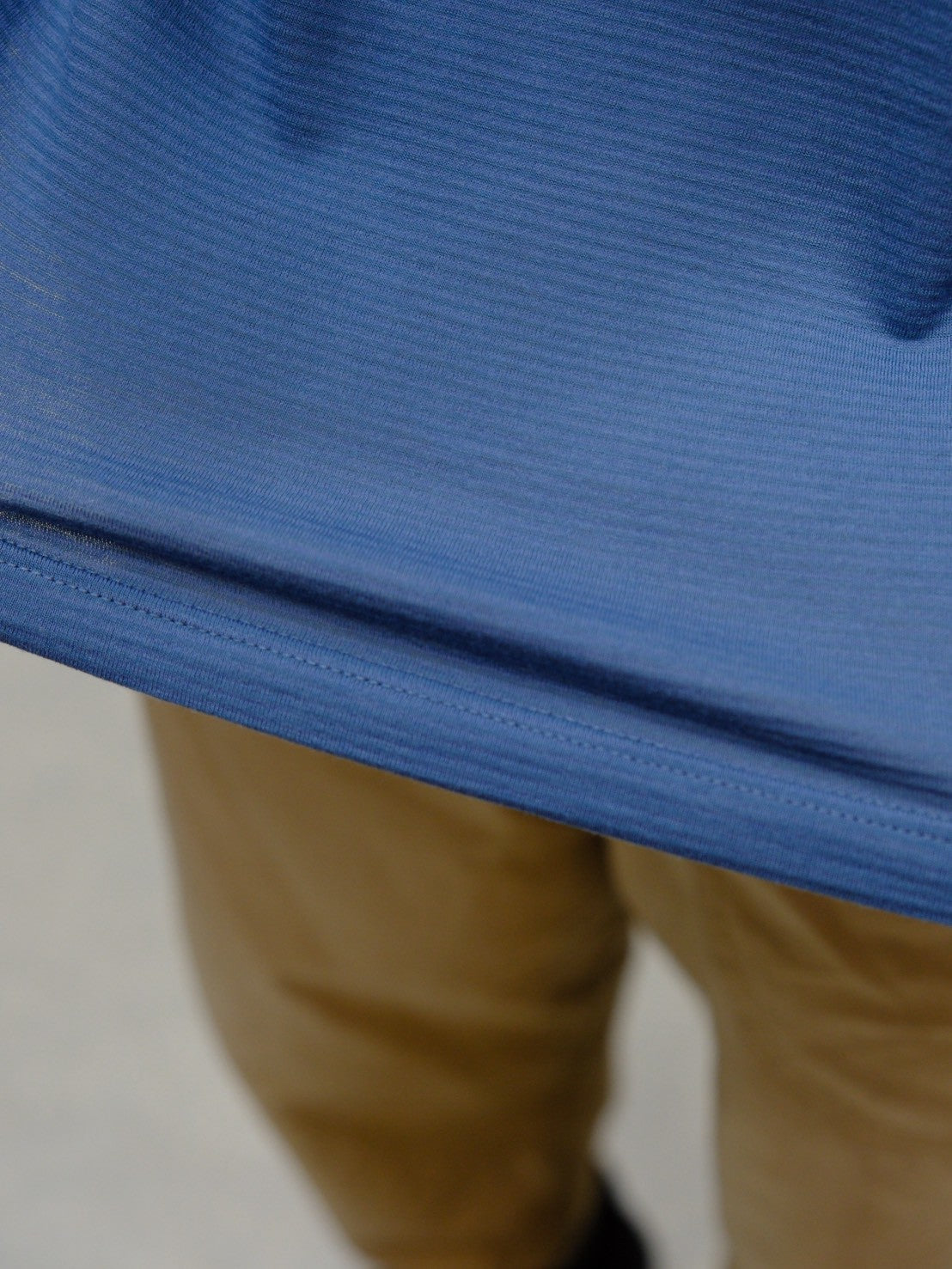 メリノウールを使い、発汗量の多い春夏でも快適に使える生地を探していました。 そしてたどり着いた答えがメリノウールとリサイクルポリエステル糸のALL ELEVATION混紡生地です。