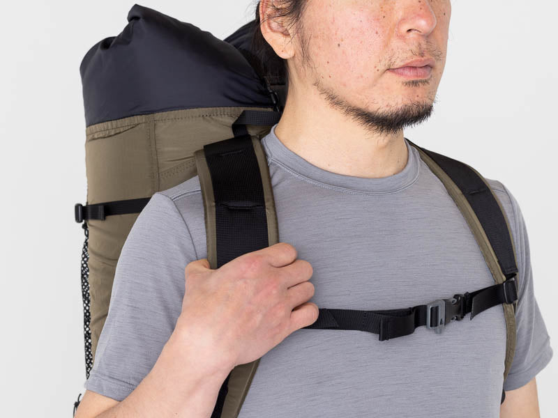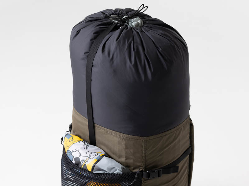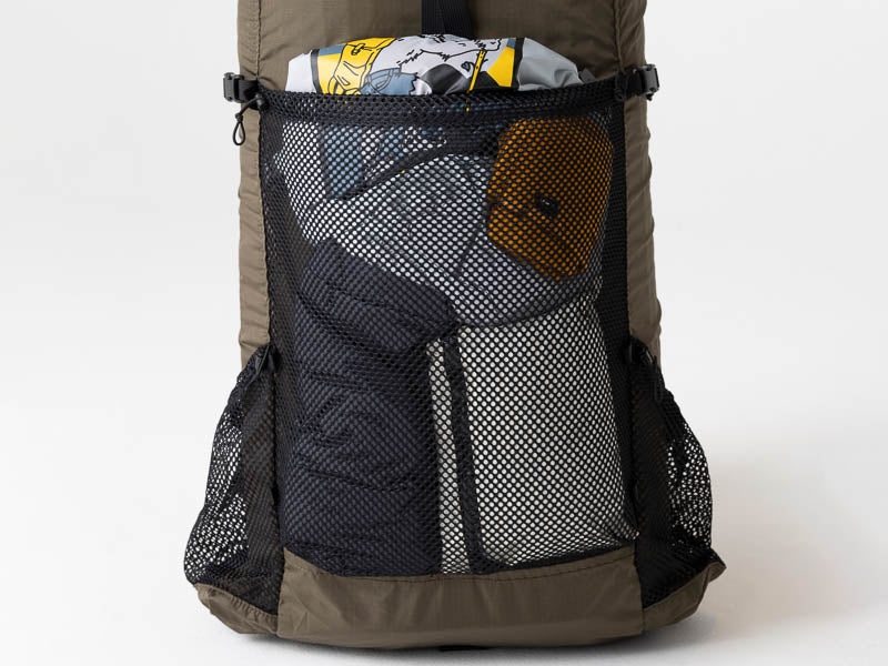 ULバックパックを代表する意匠でもあるメッシュのフロントポケットとサイドポケット。フロントポケットはシェルターやレインギアなど濡れる可能性が高いギアの収納のためたっぷりと容量をとっています。サイドポケットはボトルを2本入れられる十分な容量と背負ったままでも取り出しやすい深さにこだわりました。