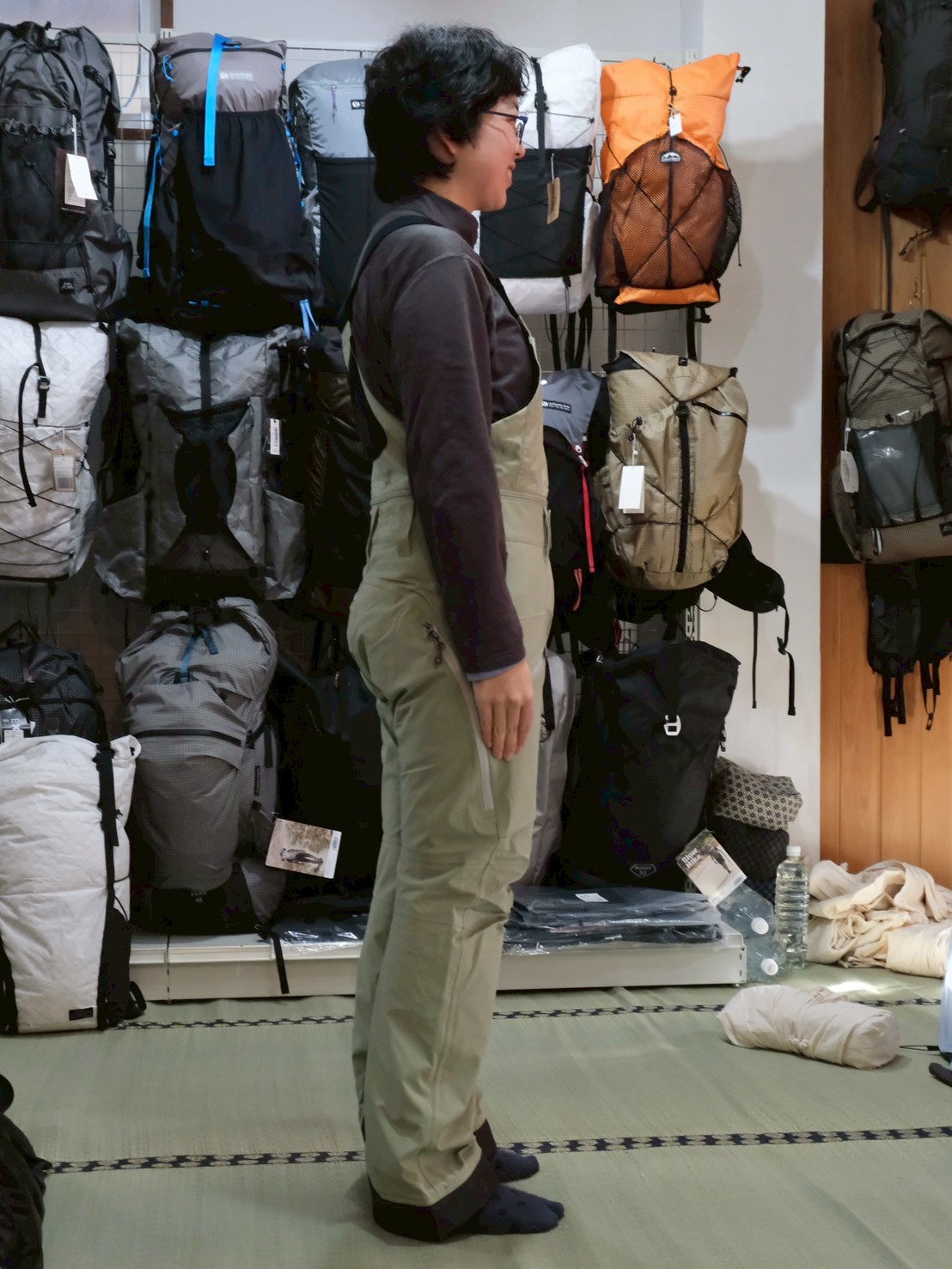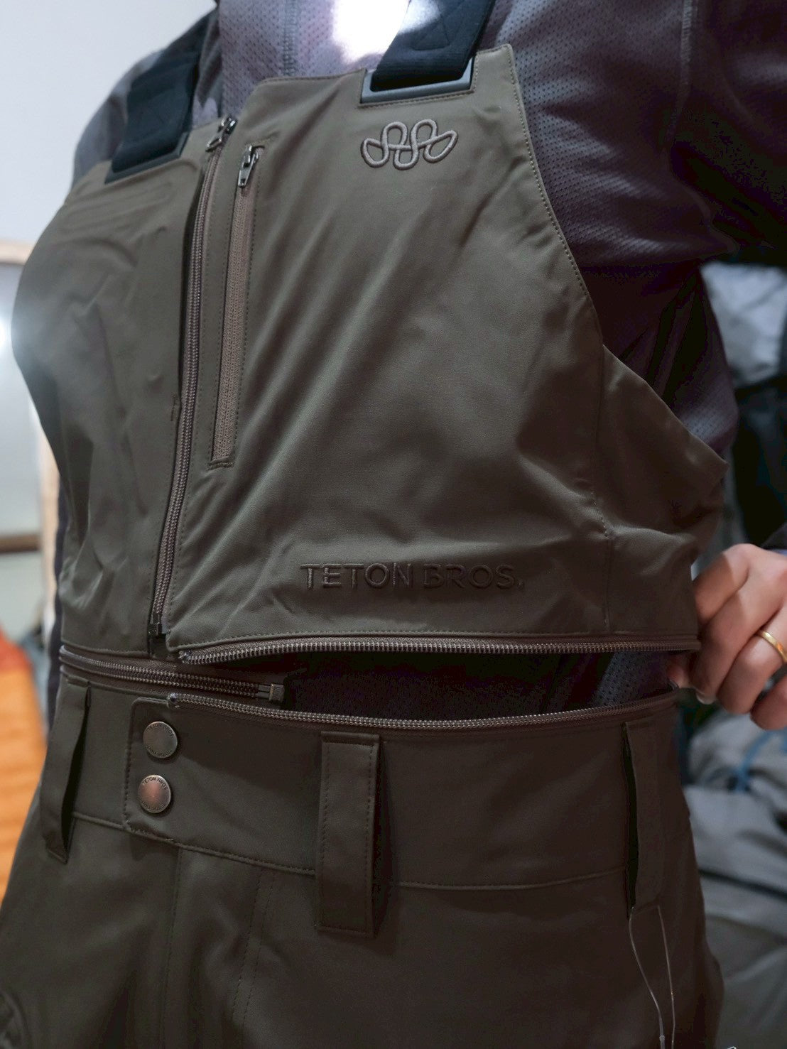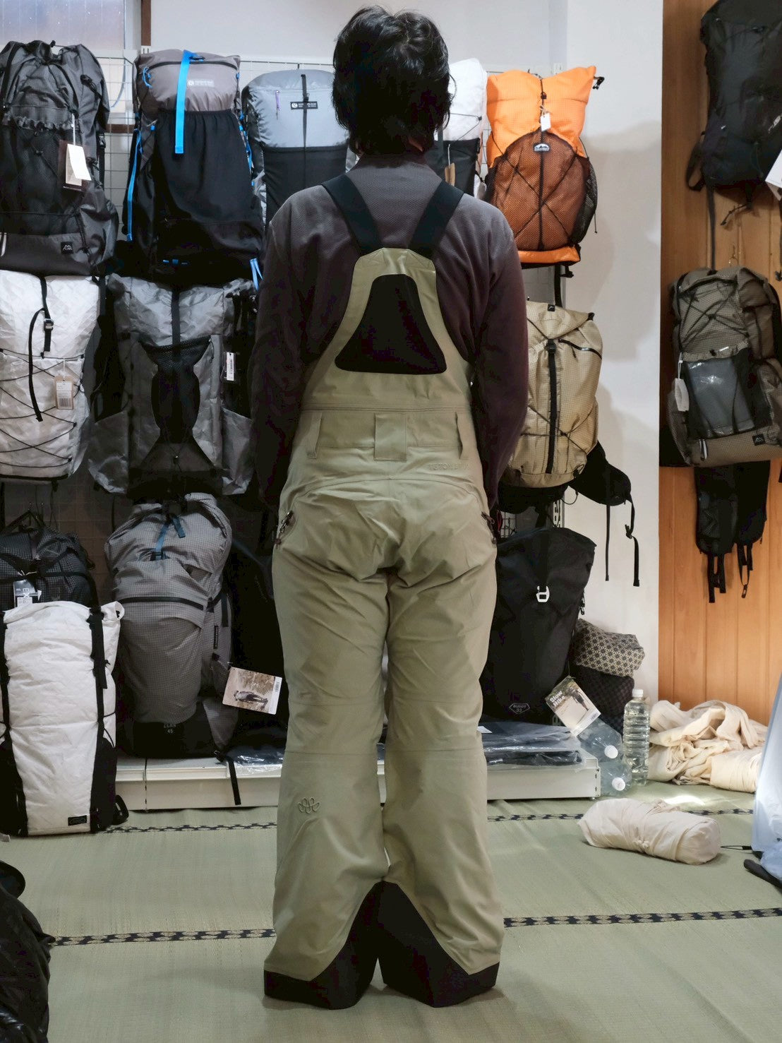 バックカントリーでは肩掛けのビブスタイル。そうすることで滑走時に埋まってもウェア内に雪が侵入することはありません。