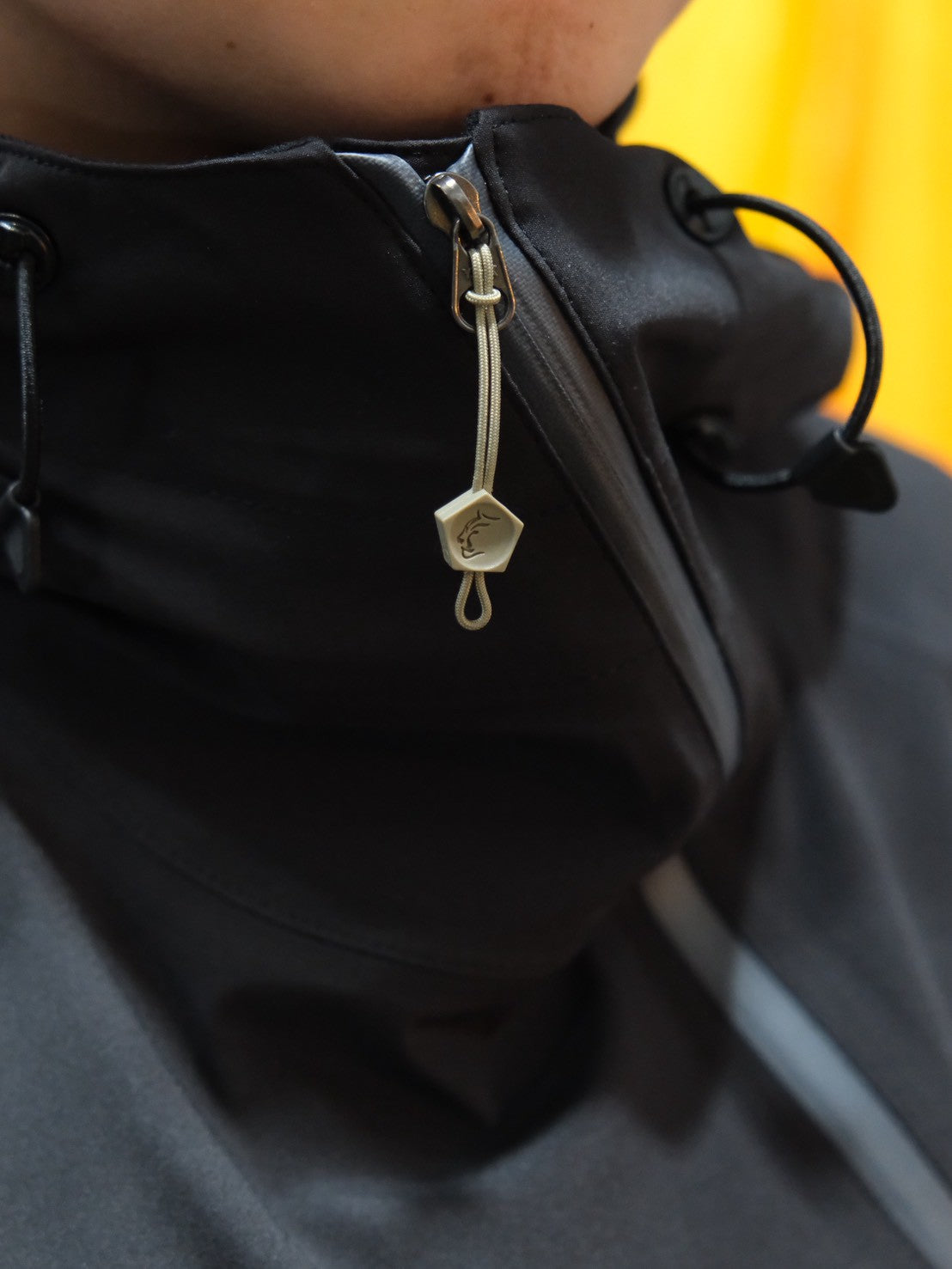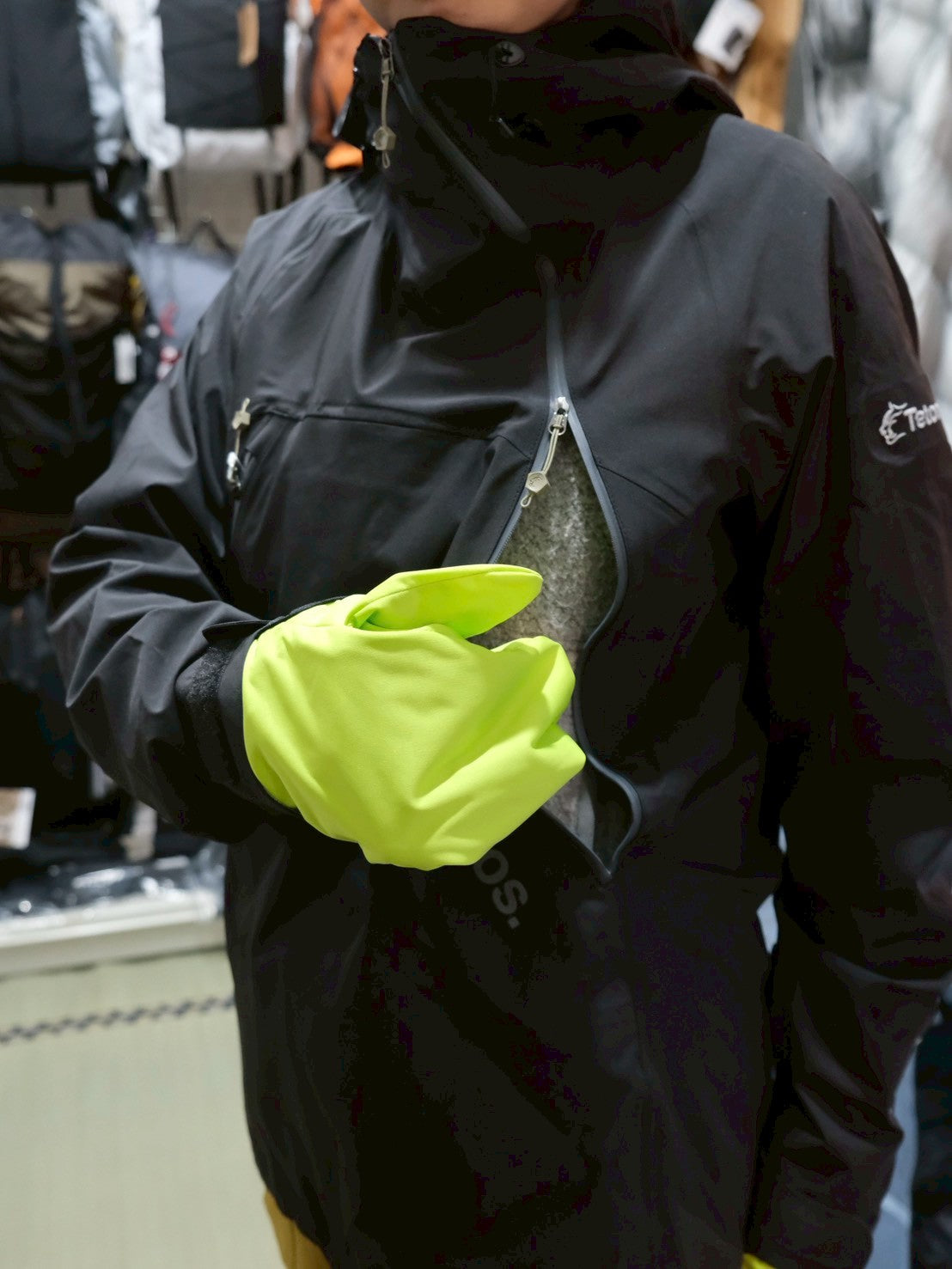 東レとの共同開発によって完成した次世代の防水通気素材です。ミクロ単位のポリウレタン繊維を何層にも吹き重ねたエレクトロスピニング製法によるESP メンブレン採用。何層にも重なるミクロの網の目が水分を遮断し、物理的な通気を可能にします。だから「透湿」ではなく「通気」。なおかつ、防水通気素材とは思えないやわらかな着心地がもうひとつの特徴です。表地は高強度ナイロンを使用し、耐久性と軽量性を両立。メカニカルストレッチにより100% ナイロンでありながら十分な伸縮性があります。裏地は吸湿速乾性に優れた20 デニールのニットバッカーにより、しなやかなテクスチャーと高機能を併せ持ち、高い防水性と通気性をバランス良く併せ持つ素材です。
