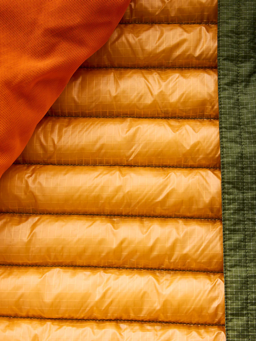 極小で滑らかな綿毛状の合成繊維は、天然ダウンに匹敵する軽さ、暖かさ、柔らかさ、圧縮性を実現。デッドエアを多く含む断熱層を形成することにより550フィルパワーダウンに相当する保温性と卓越したパッカビリティを実現しました。Primaloft Plumeは、自然の知恵と科学の融合により雨や雪の中でも長時間にわたり保温性と快適性を維持します。