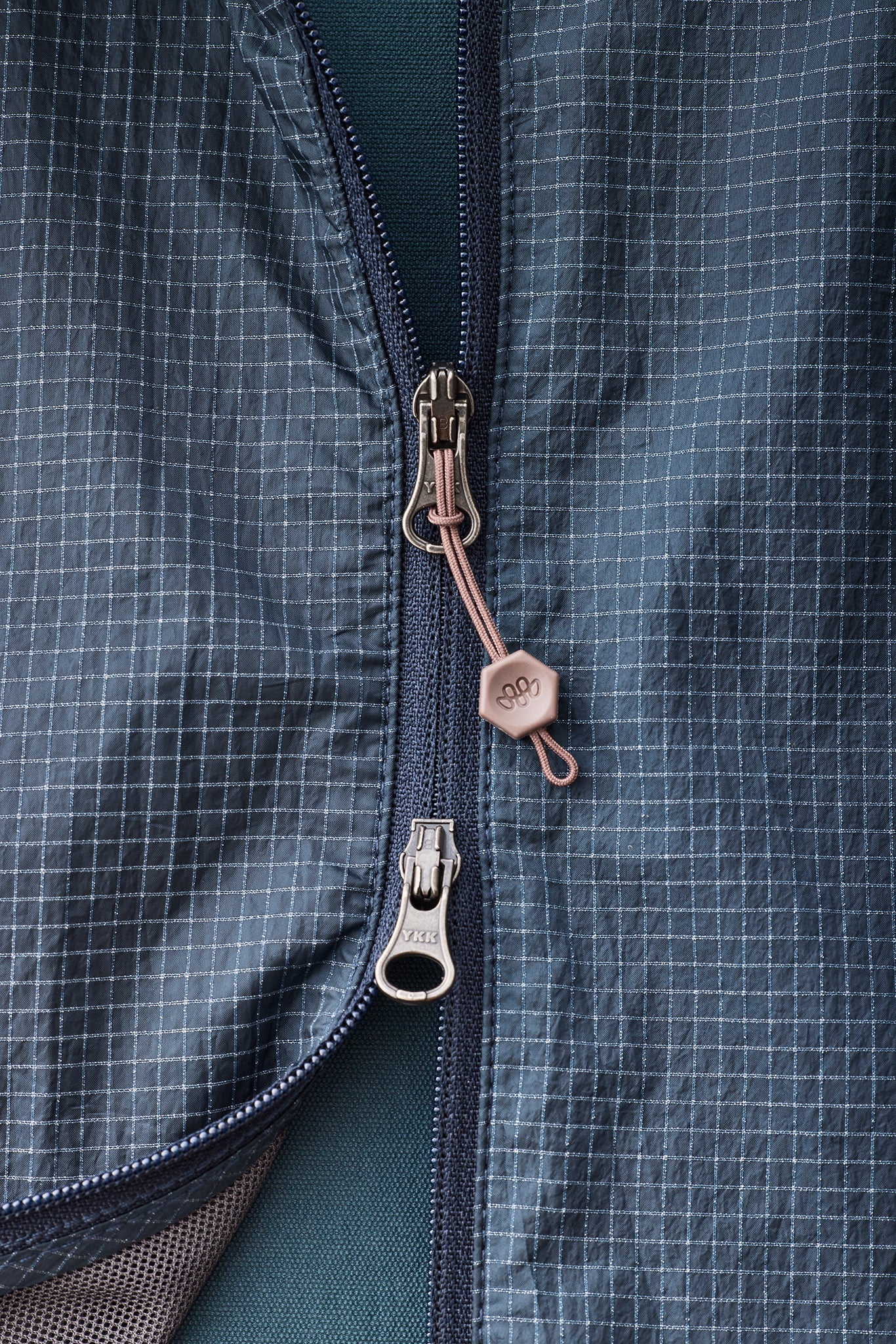 ジッパーはダブルスライダー仕様で下から開けばベンチレーションとして機能。クライミングハーネスの着用にも対応。 -