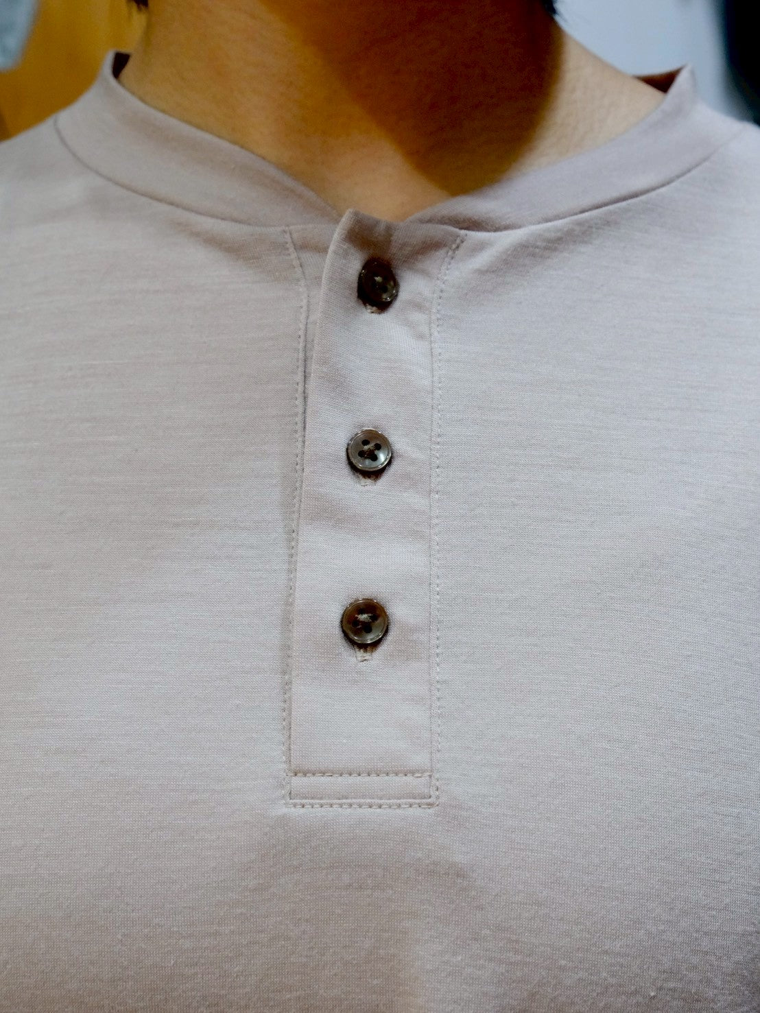 ヘンリーネックな仕様にして、袖口はリブ仕様にして、