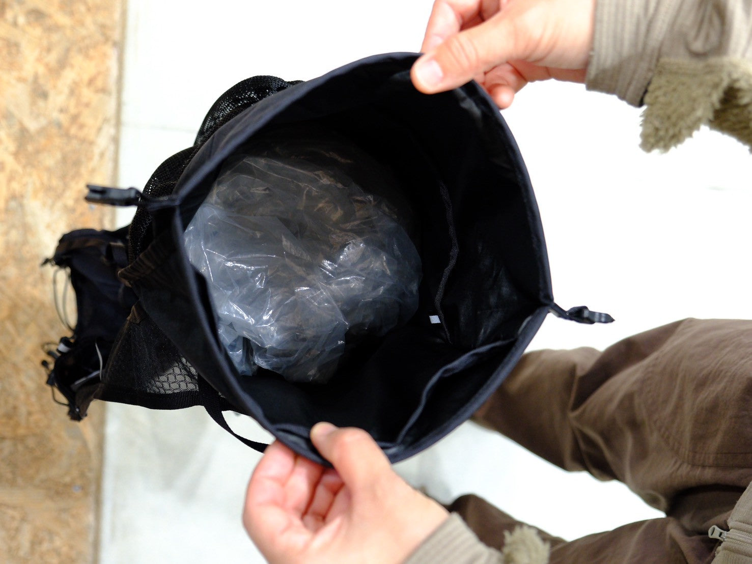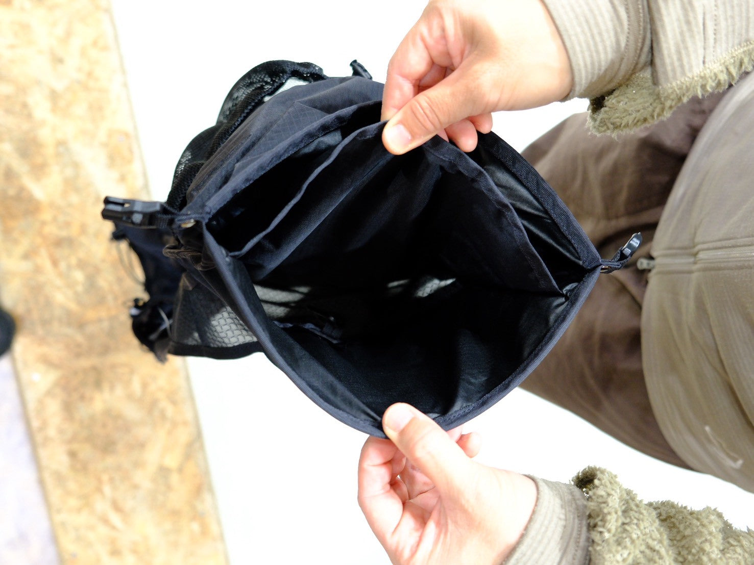 背面の大きなメッシュポケットはレインウェアやソフトシェルなど頻繁に取り出すものや、パッキングしにくいものを収納するのに便利です。上部のドローコードで絞ることができます。