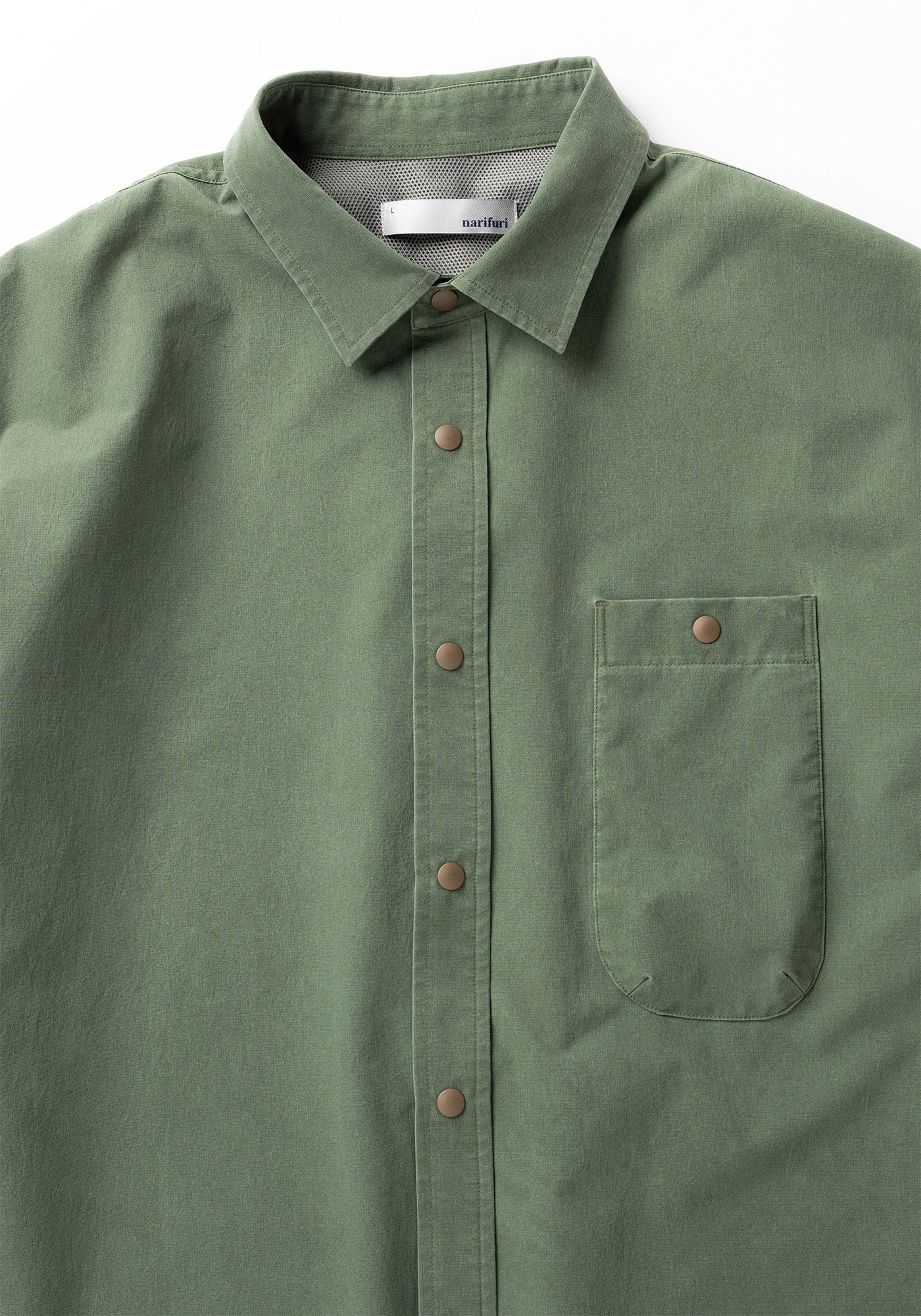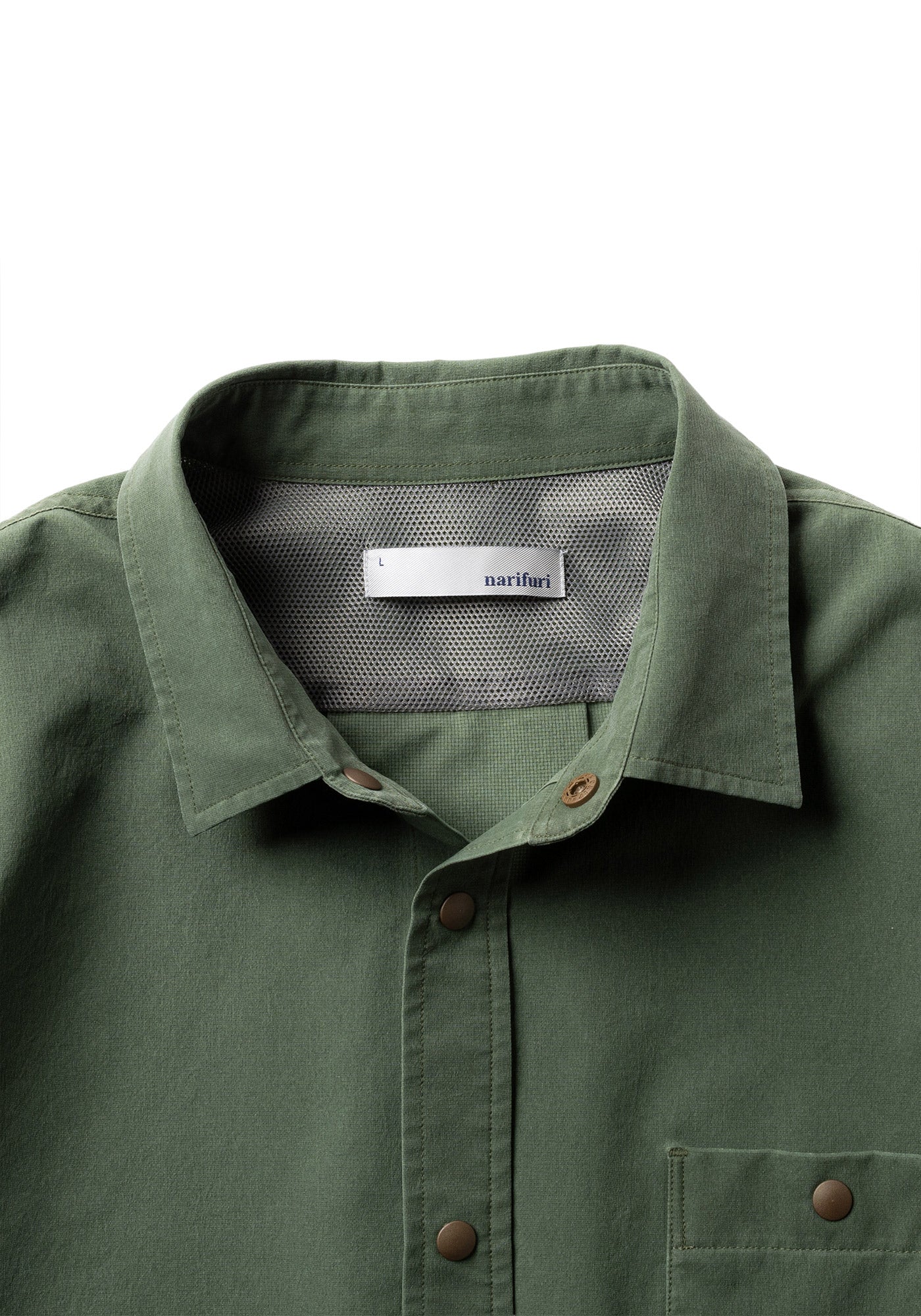 軽量かつ薄手のメッシュ生地は、畳んでバッグに入れておいてもシワになりにくいイージーケア。全てのボタンはスナップボタン仕様のため気軽に脱ぎ着が可能。