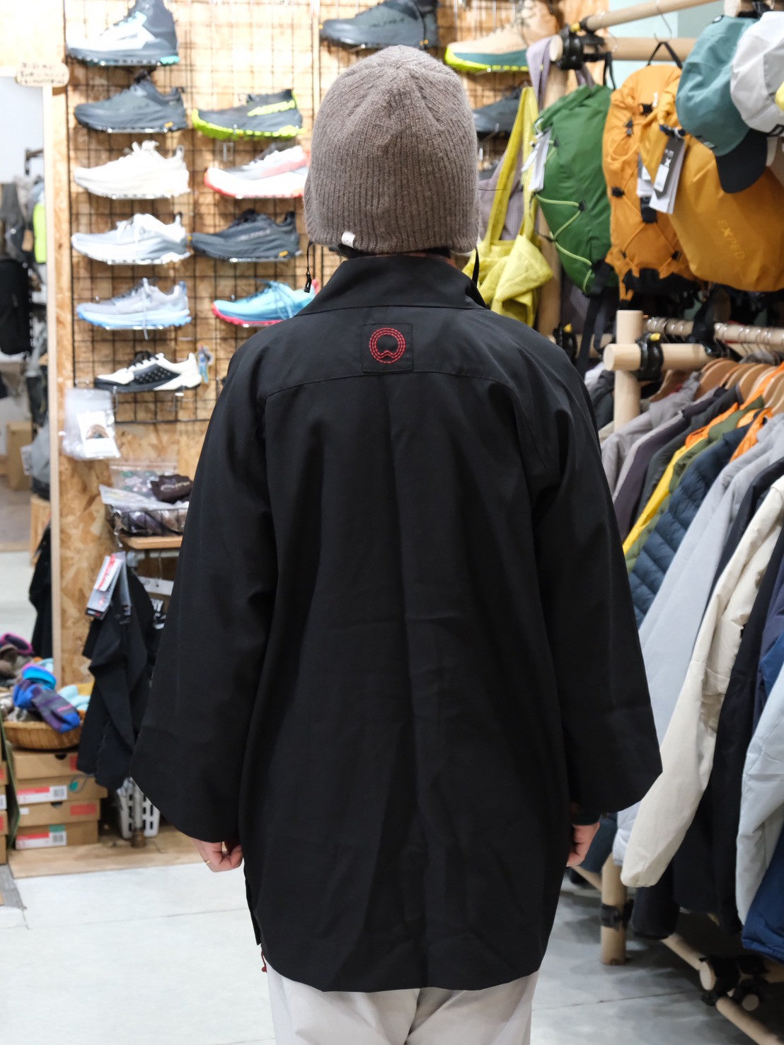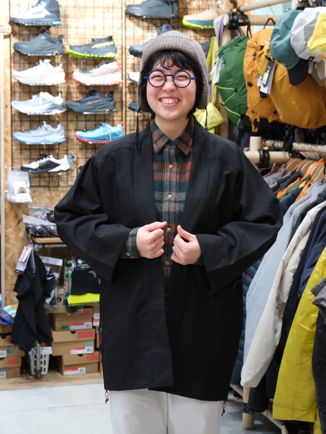 半纏には本来胸紐は付いていませんが、風が強い時のバタつきを抑えるために目立たないプラスチックのフックを付けています。また、急な登りで暑くなってきたらサイドジッパーを開けて外部の空気を入れ、オーバーヒートを軽減させることができます。 着こなし半纏はやはり前をはだけて着るのが粋ですが、それでは風が気になることもあるでしょうから、そんな時にはシルベをインナーにレイヤードして下さい。こうすることで風を和らげることができ、見た目にもグッと凌らしくなります。