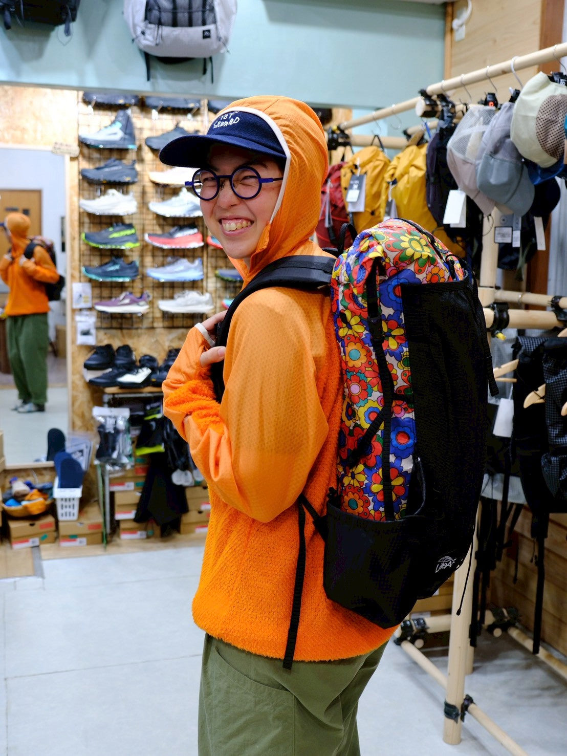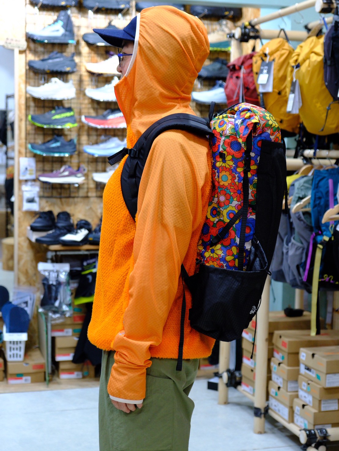 大容量のサイドポケット&フロントポケット付きの軽量フレームレスバックパックです。内側の縫い目はシーム処理されているので防水性も高く、耐久性もあるのでハードな山行にもガシガシ使えますよ~!!!オシャレで個性的な柄のプリントが山で映えますね~♪