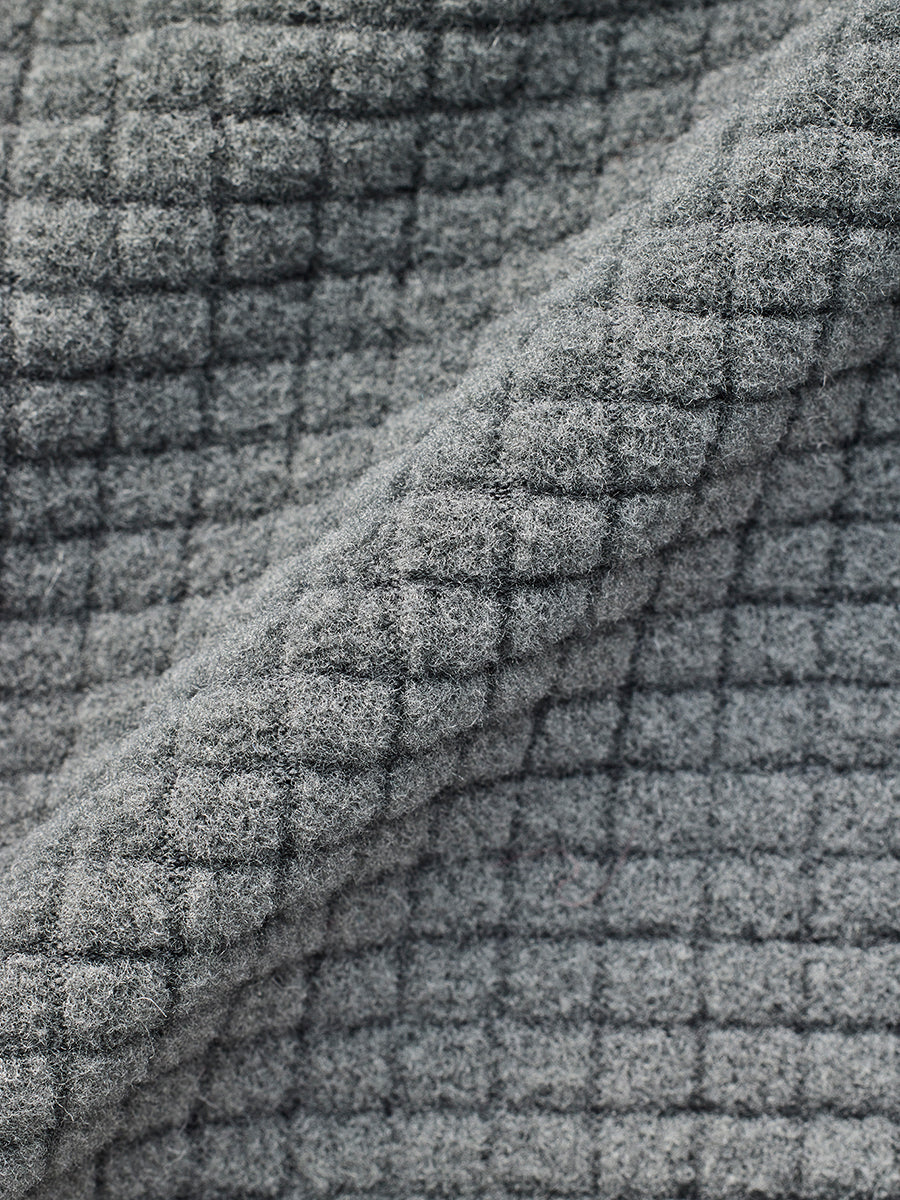 ミッドレイヤーとして、またアウターとしても使用できる様にややゆったり目のシルエットで作っています。フードがないぶん、ライトな着用感があり、また、アウターの下に着る際もフードが邪魔になりません。
