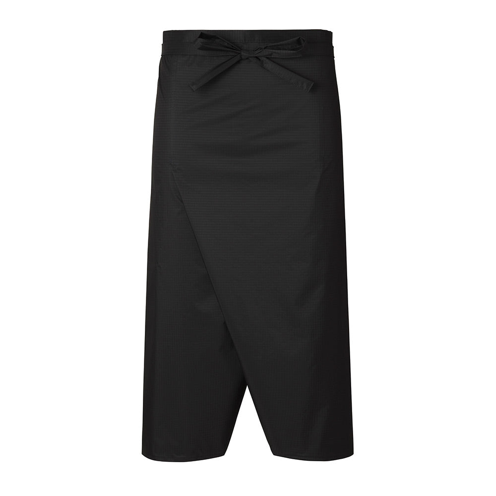 シノギングのフィールドにおいて、レインパンツとは比べ物にならないくらいの運動性とベンチレーション性が実感できて、必要十分な防水性を備えた前掛け型の雨除けです。前掛け型なので後身はカバーしません。後身が開放されているので状況によっては雨に濡れる場合がありますが雨を凌ぐという意味では十分です。少しでも濡れることを避けたい場合にはこの商品を選ばないでください。後身が開放されているので優れたベンチレーション効果と動きやすさを得ることができます。それだけでも十分動きやすいのですが、前中心に生地を重ねて裾を割ることでさらに動きやすさを追求しています。風によるバタつきが気になるときには、脇のテープを膝裏にまわして止めて簡易パンツモードで凌ぐことができます。雨だけではなく風や寒さを凌ぐ事もできるので一年を通して出番の多いアイテムです。