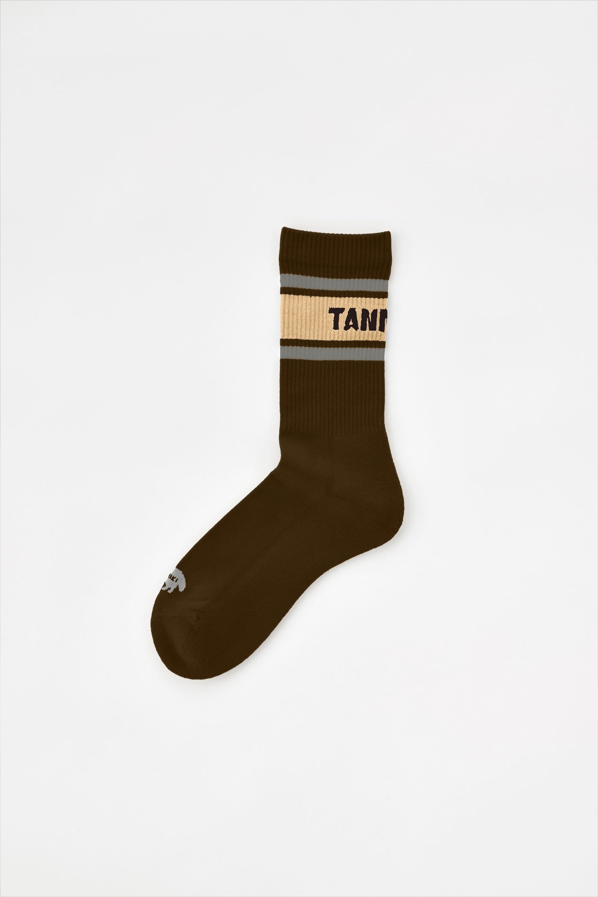 ボーダー柄の間にTANNUKIロゴを配置し、後方から見たときにロゴが読めるようにデザインされています。つま先部分からはタヌキのシルエットがのぞきます。