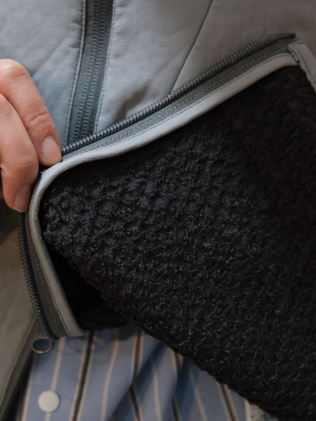 片手で開閉しやすいようにジッパーを斜めに配置したチェストポケット。見た目をすっきりさせるためにコンシールタイプのジッパーを採用。 -