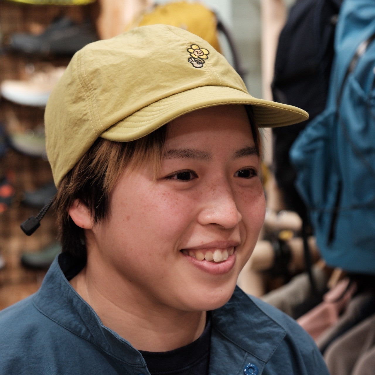 前後にゆるっとかわいいお花と太陽の刺繍の入ったキャップです。