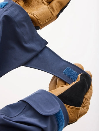 グローブのボリュームを選ばず、装着したまま袖を通せる開口部の広いカフ形状。アジャスターの取り付け部分を幅広にすることで均一なフィット感が得られる。