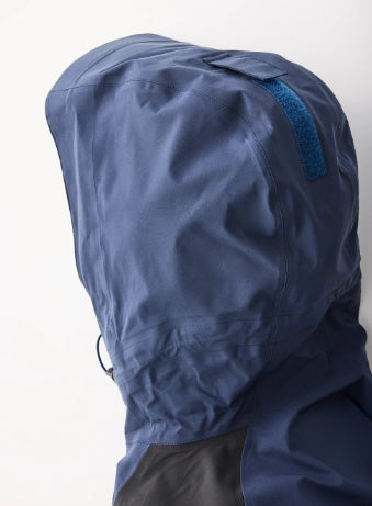 ヘルメット着用を想定したフード。前面に配置したアイレットストッパーによって縦横方向の調整も容易で、固定もリリースもワンアクション。フード上部にもベルクロのアジャスターを備える。