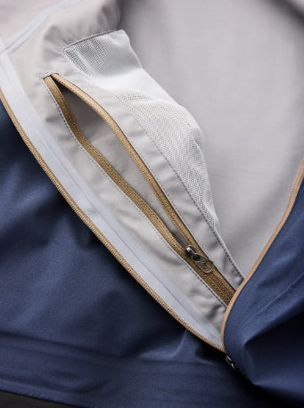 表生地は軽量性と耐久性のバランスに優れた50デニールストレッチナイロン。バックパックとの摩擦等によるストレスを受けやすい肩やウェストはTB JACKETと同じ素材で強化。いずれも現状最高水準の撥油性を兼ね備える撥水加工を施している。