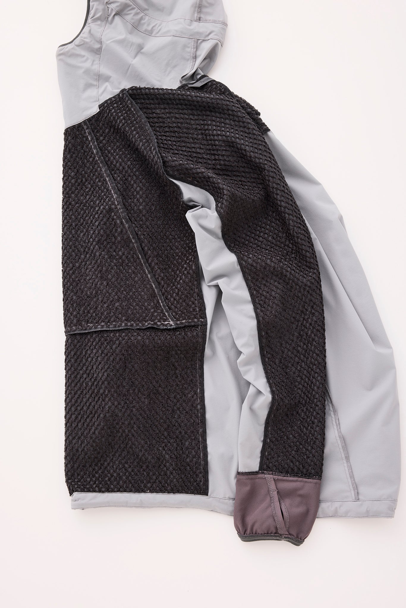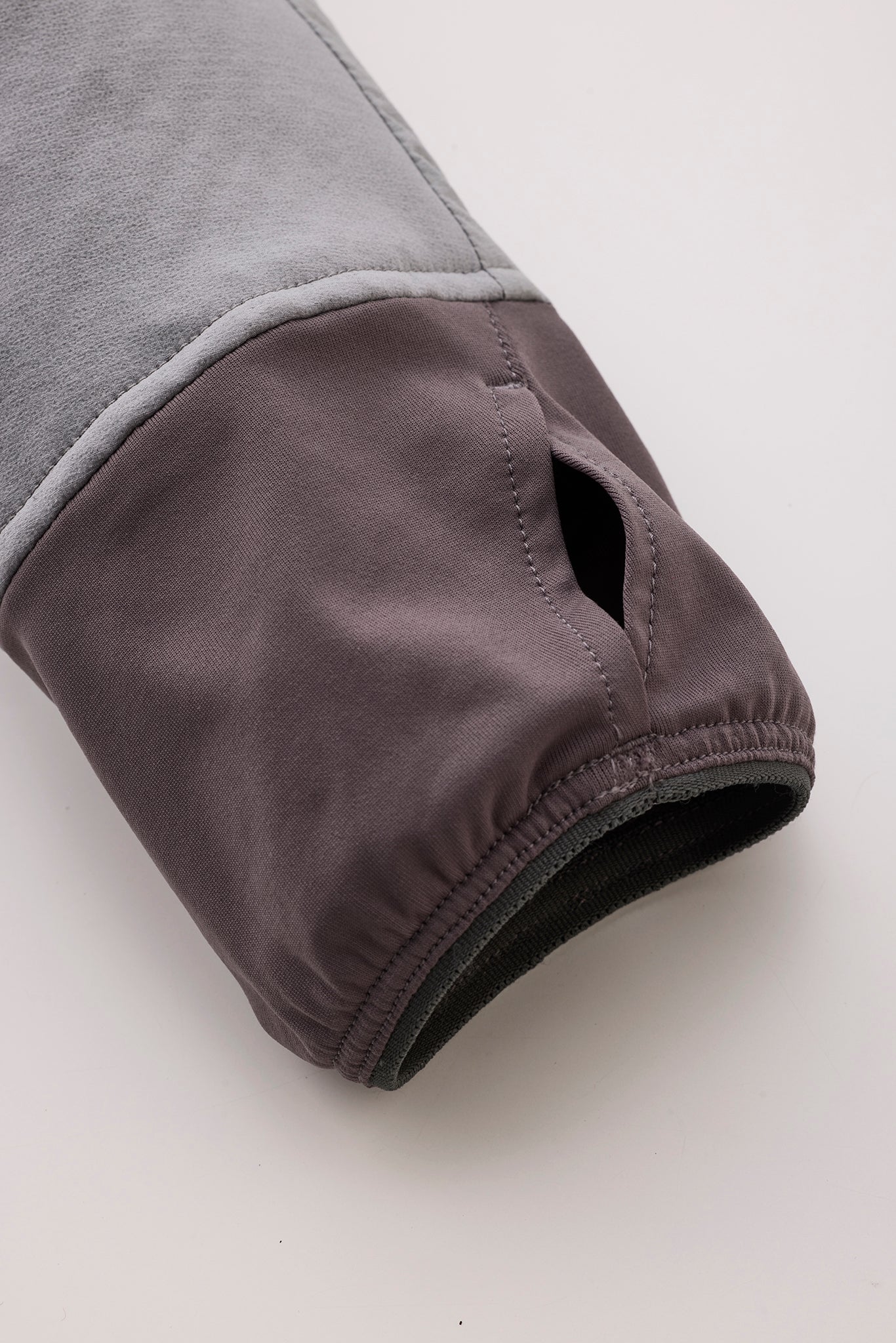 袖口にはストッチ性と速乾性に優れる素材のサムアンカーを備える。手首にしっかりフィットし、外気の侵入 を防ぐ。また、シェルの袖口のベルクロと干渉しないため、レイヤリング時も快適。