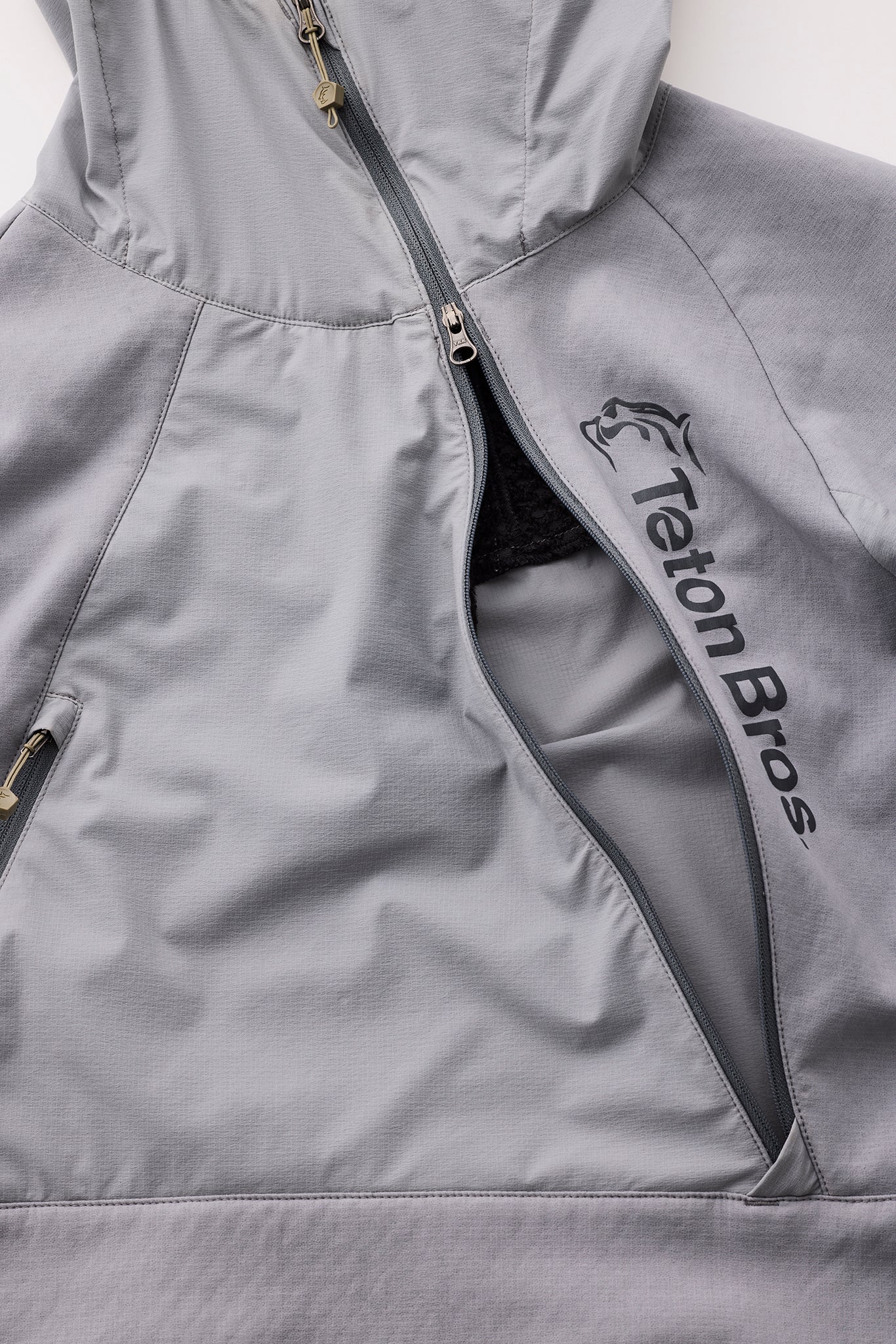 TSURUGI JACKETから継承したフロントのジッパーは、 プルオーバーでも着脱しやすく、上下から開けるダブル スライダーによって、ベンチレーションとしても効果的。 -